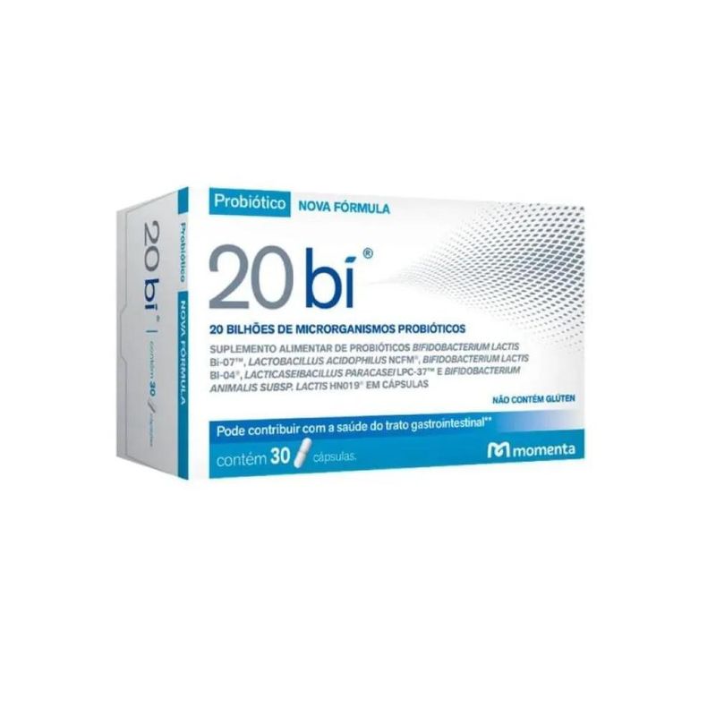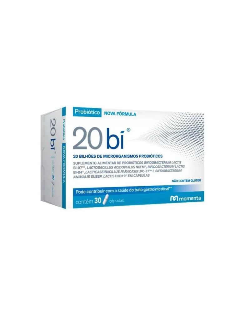 20 bi é um suplemento alimentar em cápsulas composto por probióticos que contribuem para o equilíbrio da flora intestinal. São eles: Lactobacillus acidophilus NCFM®, Lactobacillus paracasei Lpc-37™, Bifidobacterium lactis BI-04™, Bifidobacterium lactis BI-07™ e Bifidobacterium bifidum Bb-02™. O consumo de 20 bi deve estar associado a uma alimentação equilibrada e hábitos de vida saudáveis. Probióticos são microorganismos vivos que ajudam o corpo a absorver melhor e com mais facilidade os nutrientes dos alimentos, auxiliando a digestão e evitando a sensação de constipação e prisão de ventre. Aliados a uma dieta e hábitos de vida saudáveis, promovem efeitos benéficos à saúde.