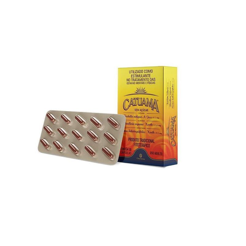 Catuama é um produto utilizado de modo tradicional como estimulante sobre o sistema nervoso central no combate às estafas (cansaços) físicas e mentais. O tempo médio de início de ação do produto vai depender das condições de cada organismo. Cápsula Uso adulto. Este produto não deve ser utilizado por via de administração não recomendada. As cápsulas devem ser ingeridas por via oral. Os produtos tradicionais fitoterápicos não devem ser administrados pelas vias injetável e oftálmica. a posologia da Catuama cápsulas foi estabelecida em 1 a 2 cápsulas, 2 vezes ao dia, antes das refeições. Utilizar 1 a 2 cápsulas do produto, a cada 12 horas. a dose diária máxima deste produto deverá ser 4 capsulas, dividida em 2 doses. Este produto não deve ser partido, aberto ou mastigado. Siga corretamente o modo de usar. Em caso de dúvidas sobre este produto, procure orientação com seu farmacêutico ou profissional da saúde. Não desaparecendo os sintomas, procure orientação de seu profissional de saúde. Solução oral Via oral. Dosagem a posologia do Catuama solução oral foi estabelecida em 25mL, 2 vezes ao dia, antes das refeições (dosador incluído). Nomenclatura popular: Catuaba, Guaraná e Marapuama. Nomenclatura botânica completa: Trichilia catigua A. Juss. Paullinia cupana Kunth Croton heliotropiifolius Kunth. Família: Meliaceae Juss. Sapindaceae Juss e Euphorbiaceae Juss. Parte da planta utilizada: Casca do caule (Catuaba), Semente (Guaraná) e Caule (Marapuama). Cada cápsula de 310 mg contém: Extrato seco de guaraná (Paullinia cupana Kunth) equivalente a 20 mg de cafeína (marcador) 125 mg Extrato seco de catuaba (Trichilia catigua A. Juss.) equivalente a 37 µg de beta-sitosterol (marcador) 87,5mg Extrato seco de Marapuama (Croton heliotropiifolius Kunth) equivalente a 52 µg de lupeol (marcador) 87,5 mg Excipientes: extrato seco de gengibre. Cada 25mL contém: Extrato Fluido de Guaraná 1,250 mLa Extrato Fluido de Catuaba 0,875 mLb Extrato Fluido de Muirapuama 0,875 mLc Alcoolatura de Gengibre 0,200 mLd Excipientes: açúcar, metilparabeno, caramelo, vanilina e água purificada. a Equivalente a 40mg de cafeína (marcador). b Equivalente a 74mcg de beta-sitosterol (marcador). c Equivalente a 104mcg de lupeol (marcador). d Equivalente a 120mcg de gingerol e gingerdionas (marcadores). Conservar em temperatura ambiente (temperatura entre 15ºC e 30ºC). O produto Catuama cápsulas apresenta validade de 36 meses. Número de lote e datas de fabricação e validade: vide embalagem. Não use produto com o prazo de validade vencido. para sua segurança, guarde o produto na embalagem original. Após a abertura da embalagem, o produto deve ser guardado adequadamente para se manter próprio ao consumo dentro do prazo de validade. Características do medicamento Cápsula O produto Catuama cápsulas apresenta-se em cápsulas gelatinosas duras de coloração vinho, contendo um pó granulado fino e homogêneo, de cor castanho avermelhado e com odor característico. Solução oral O Catuama solução oral apresenta-se como um líquido móvel, translúcido, de cor castanho avermelhado e com odor aromático característico. Seu sabor é doce, agradável, com final levemente amargo. Antes de usar, observe o aspecto do produto. Caso ele esteja no prazo de validade e você observe alguma mudança no aspecto, consulte o farmacêutico para saber se poderá utilizá-lo. Este produto deve ser mantido fora do alcance das crianças. Medicamento fitoterápico. Cápsula gelatinosa dura Cartucho com 2 blisteres contendo 15 capsulas cada. Via oral. Uso adulto. Solução oral Frasco plástico transparente âmbar com 500mL. Via oral. Uso adulto.