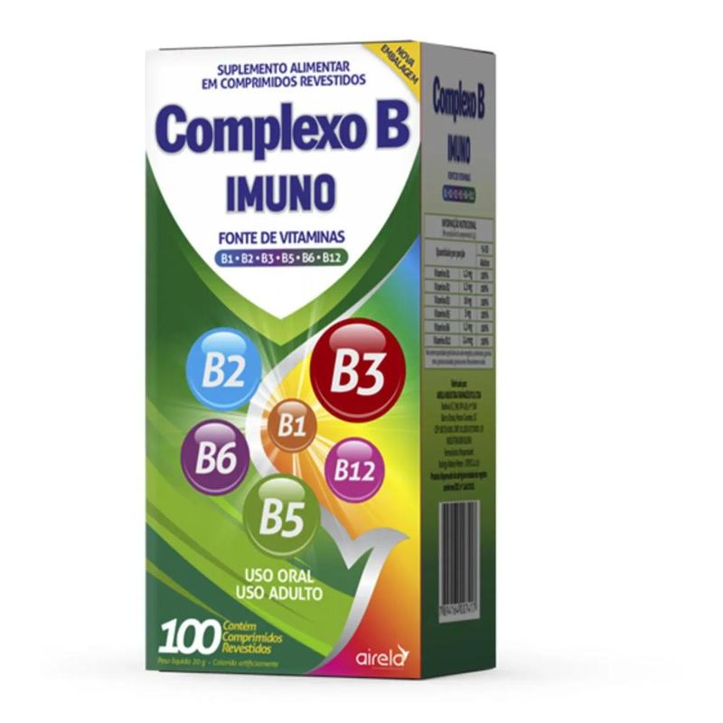 Contém 100 ComprimidosComplexo B ( UM CP POR DIA)....................................................B12 B1 B2 B3 B5 B6 B12 com 100cp....................................................fonte de vitaminas  Complexo B Imuno é uma fonte de vitaminas que reúne todas as vitaminas do complexo B, sendo elas B1, B2, B3, B5, B6, B7, B9, B12, cada comprimido preenche 100% do valor diário de todas essas vitaminas. O Complexo B possui grandes e diversos benefícios para a saúde, tem como destaque o auxilio no fortalecimento da imunidade no organismo assim como a recuperação de anemia.  Além disso possui propriedades que ajudam na saúde do sistema nervoso, função intestinal e na saúde da pele, cabelos e unhas. - Fortalecimento do sistema imunológico;- Ajuda no combate a anemia;- Auxilia na saúde do sistema nervoso;- Ajuda na redução do estresse;- Ajuda na saúde da pele, cabelos e unhas;- Auxilia na função intestinal;- Produto lacrado e de alta qualidade.Peça ja o seuEnviamos no mesmo diaNÃO CONTÉM GLÚTEM    Produto dispensado da obrigatoriedade de registro conforme RDC 240/2018