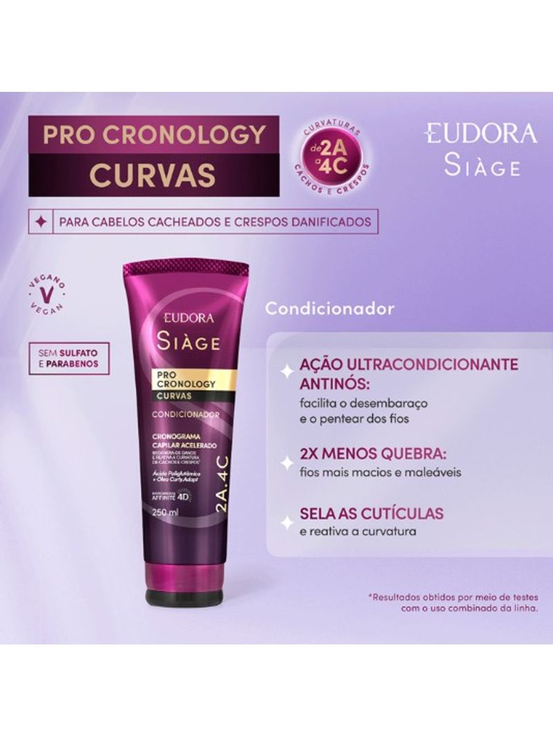 O Condicionador Siàge Pro Cronology Curvas é indicado para cabelos cacheados e ondulados, que estão danificados, volumosos, sem definição ou desbotados. Os ativos da fórmula foram desenvolvidos especialmente para os fios texturizados, trazendo volume, hidratação e definição em apenas 2 semanas.