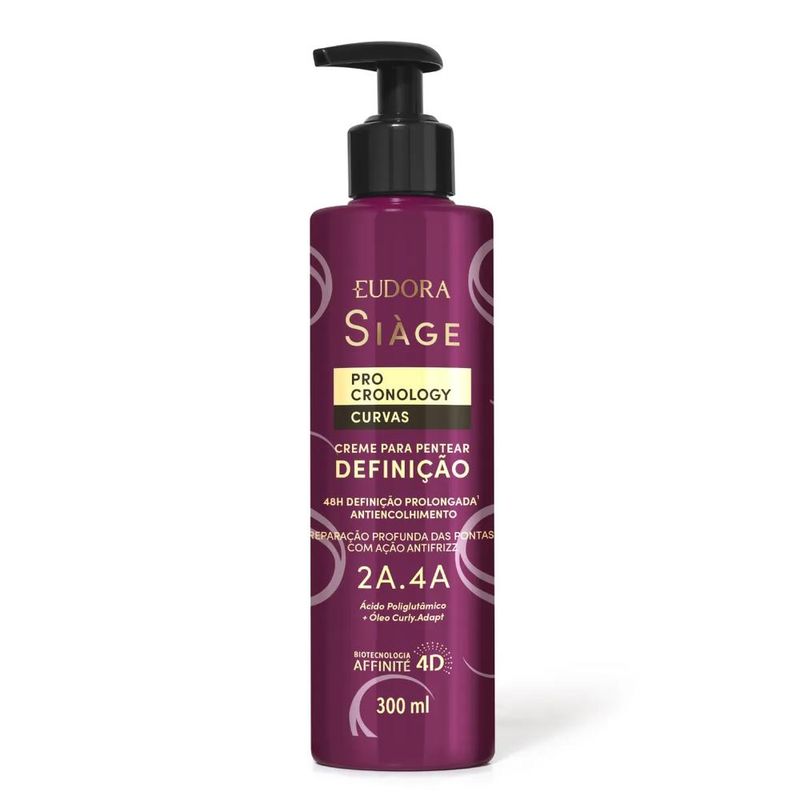 O que é e para que serve o Creme para Pentear Definição Siàge Eudora Pro Cronology Curvas? Siàge Pro Cronology Curvas uniu os maiores desejos das crespas e cacheadas em uma linha de cronograma capilar acelerado que se adequa às necessidades de diferentes curvaturas e recupera em 2 semanas até os danos mais severos (desidratado, ressecado e extremamente danificado). A linha reconhece o ponto de torção dos fios, agindo nas camadas mais profundas da fibra e, por isso, garante resultados potentes e duradouros, com regeneração até a última curva. Age nas 3 etapas do cronograma proporcionando hidratação, nutrição com reposição de lipídios e uma reconstrução poderosa que repara os danos. Enriquecida com Óleo Curly Adapt, obtido pela extração concentrada das sementes de amaranto, rico em ácidos graxos e com alta aderência à fibra capilar de cabelos cacheados e crespos, e com o Ácido Poliglutâmico, um ativo biotecnológico obtido por fermentação natural, reconhecido pela sua hidratação potente e eficaz. Benefícios e diferenciais de Siàge Pro Cronology Curvas Óleo Curly Adapt + Ácido Poliglutâmico. Conta com a biotecnologia Affinité 4D. É vegano e Cruelty Free (não testado em animais). Como usar o Creme para Pentear Definição Siàge Eudora Pro Cronology Curvas? Após o uso dos outros produtos da linha, com os cabelos limpos e úmidos, aplique uma pequena quantidade de produto em pequenas mechas, uniformemente, do comprimento em direção às pontas, modele e finalize como desejar. Não enxágue. Pode ser usado diariamente. Advertências Uso externo. Não ingerir. Caso haja contato com os olhos, lave-os abundantemente. Se houver irritação, suspenda o uso imediatamente e procure orientação médica. Mantenha fora do alcance das crianças.