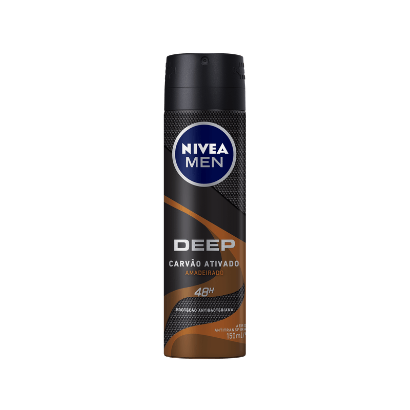 NIVEA MEN DEEP Antitranspirante com proteção de 48hrs, proporcionando uma sensação duradoura de pele limpa e seca, exatamente como após o banho. Sua fórmula eficaz com Carvão Ativado atua poderosamente contra bactérias e proporciona uma fragrância amadeirada com notas de chocolate e lavanda. - O poder do carvão ativado em uma fragrância masculina de longa duração - Sensação de frescor e limpeza