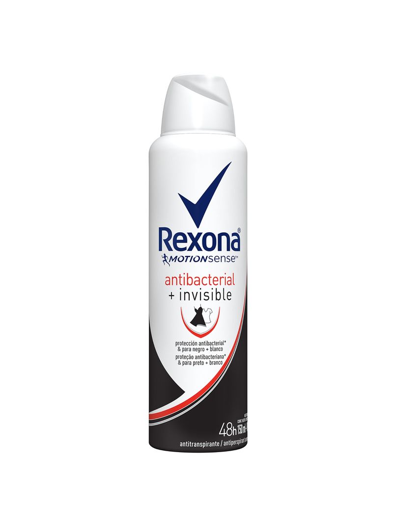 O Desodorante Aerosol Rexona Antibacterial Invisible Feminino 150ml evita manchas brancas e amarelas, garantindo até 48 horas de proteção contra os odores da transpiração, mais proteção antibacteriana. Rexona Antibactrial Invisible é formulado com inovadora fórmula, que combina a exclusiva tecnologia Motionsense com o inovador Fluid AP, que garante proteção contra as manchas e a transpiração.Como Usar: Agite antes de usar. Aplicar somente nas axilas a não menos de 15cm da pele.