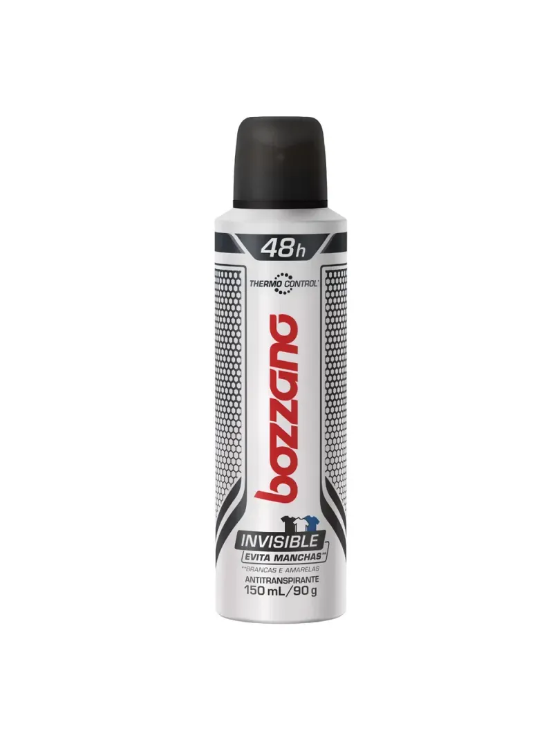 O Desodorante Aerosol Bozzano Thermo Control Invisible 150ml conta com tecnologia exclusiva que deixa você mais confiante para aproveitar ao máximo das suas atividades diárias. Sua fórmula com 48h de proteção não deixa resíduos e evita o aparecimento de manchas, mostrando a cor das suas roupas e não as manchas causas pela transpiração.Como Usar: Agite antes de usar. Aplique a uma distância de 15cm das axilas e espere secar antes de se vestir.