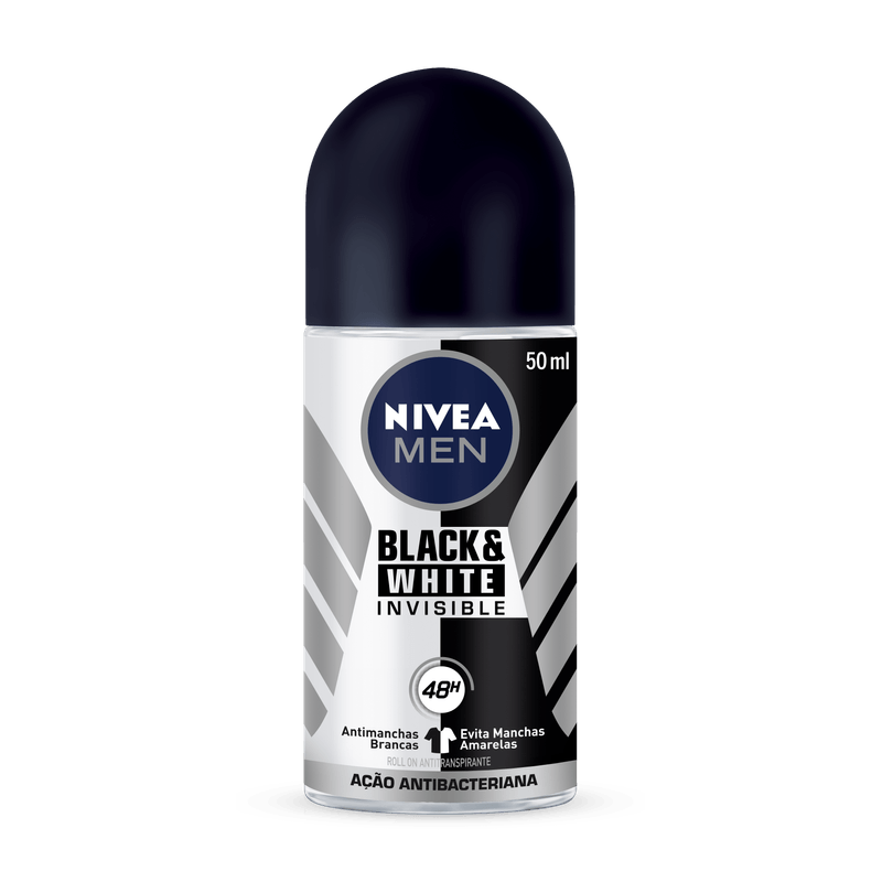 NIVEA Men Desodorante Antitranspirante Roll-on Invisible for Black & White: O 1º Antitranspirante antimanchas combinado com uma poderosa fórmula antibacteriana que elimina 99,99%das bactérias*. Protege suas roupas do preto ao branco. 48 horas proteção eficaz e você livre de manchas*, suor e do mau odor: NIVEA Men Desodorante Antitranspirante Roll-on Invisible for Black & White, 50ml.