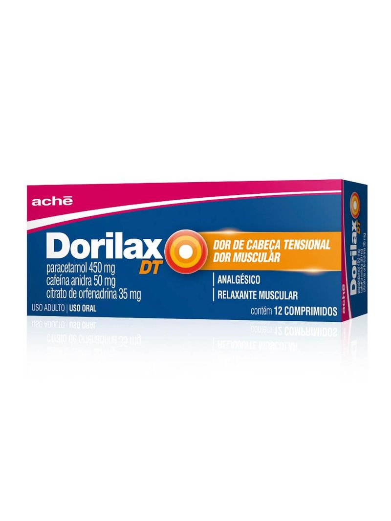 Dorilax DT possui ação analgésica (elimina ou diminui a dor) e relaxante muscular. Você deve tomar os comprimidos com líquido, por via oral. Dorilax DT 450 mg + 50 mg + 35 mg 1 a 2 comprimidos respeitando-se o intervalo de 8/8h ou de 6/6h, fora do horário das refeições, pois sua administração em conjunto com alimentos pode retardar a absorção e o efeito do medicamento. Não ultrapassar a dose máxima diária de 8 comprimidos. A duração do tratamento não deverá exceder 3 dias seguidos, a menos que prescrito pelo médico. Não há estudos dos efeitos de Dorilax DT administrado por vias não recomendadas. Portanto, por segurança e para garantir a eficácia deste medicamento, a administração deve ser somente por via oral, conforme recomendado pelo médico. Interrupção do tratamento O tratamento pode ser interrompido a qualquer instante sem provocar danos ao paciente. Siga corretamente o modo de usar. Em caso de dúvidas sobre este medicamento, procure orientação do farmacêutico. Não desaparecendo os sintomas, procure orientação de seu médico ou cirurgião-dentista. Este medicamento não deve ser partido, aberto ou mastigado. Cada comprimido de Dorilax DT contém: Paracetamol 450 mg Cafeína anidra 50 mg Citrato de orfenadrina (equivalente a 20,4 mg de orfenadrina base) 35 mg Excipientes: amido, povidona, dióxido de silício e estearato de magnésio. Conservar em temperatura ambiente (entre 15 e 30°C). Proteger da luz e umidade. Número de lote e datas de fabricação e validade: vide embalagem. Não use medicamento com o prazo de validade vencido. Guarde-o em sua embalagem original. Características do medicamento Comprimido branco, redondo, biconvexo, liso em ambas as faces. Antes de usar, observe o aspecto do medicamento. Caso ele esteja no prazo de validade e você observe alguma mudança no aspecto, consulte o farmacêutico para saber se poderá utilizá-lo. Todo medicamento deve ser mantido fora do alcance das crianças. Comprimidos de 450 mg + 50 mg + 35 mg Embalagens com 12 e 100 comprimidos. Uso oral. Uso adulto.