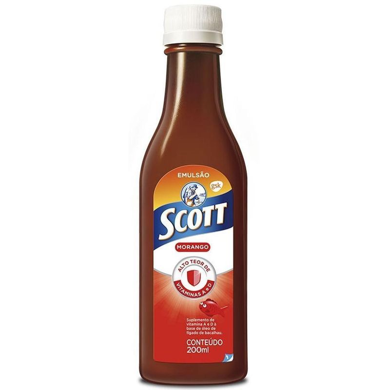 Emulsão Scott Óleo de Fígado de Bacalhau Sabor Morango - Suplemento alimentar em emulsão à base de óleo de fígado de Bacalhau - é fonte de Óleo de Peixe, Vitamina D e Vitamina A que auxilia no funcionamento do sistema imune, na visão e na manutenção da pele.