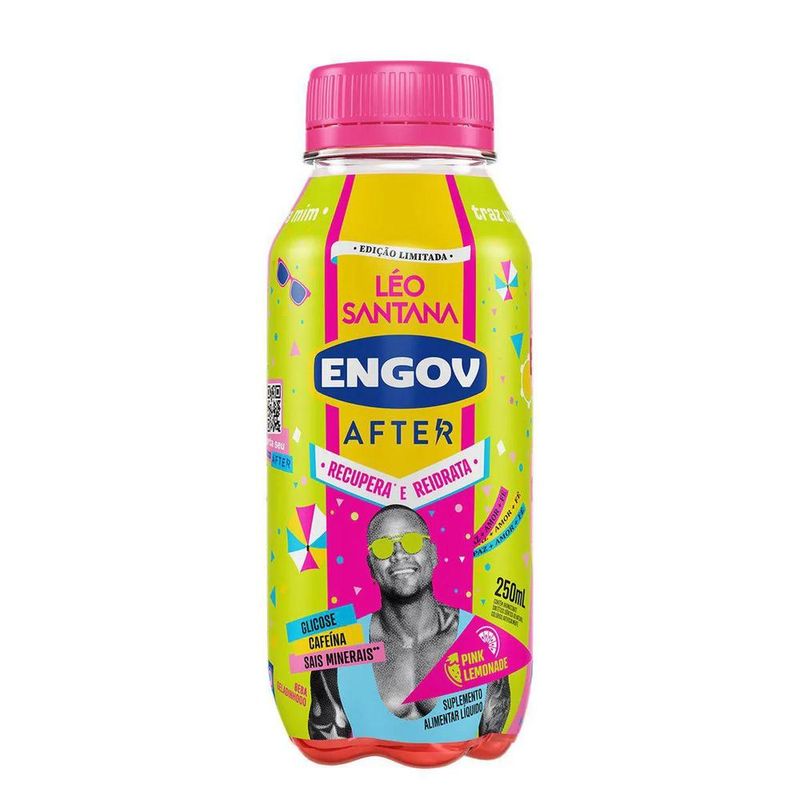 O que é e para que serve o Engov After? Engov After é uma bebida ideal para reidratar, reenergizar e se recuperar de momentos de curtição. Pronto para consumo, sua fórmula possui glicose, sais minerais e cafeína na dose ideal para recuperar os eletrólitos perdidos após momentos intensos, reidratar com a dose ideal e reenergizar para que você possa aproveitar o dia seguinte. Principais ativos e como atuam Glicose Principal fonte de energia para nossas células realizarem o conjunto de reações químicas e físico-químicas que fornecem energia para nosso organismo1. A Maltodextrina, presente na formulação de Engov After, é um carboidrato de rápida absorção, que aumenta rapidamente o nível glicêmico no organismo. Sais minerais Engov After possui Citrato trissódico dihidratado e cloreto de sódio. O sódio é um nutriente essencial para nosso organismo. Ele contribui para a regulação osmótica dos fluidos e atua na condução de estímulos nervosos e na contração muscular. Cafeína Responsável por melhorar a energia em nosso corpo, agindo positivamente no humor, disposição e performance cognitiva. Benefícios e diferenciais do Engov After Produto pronto para consumo. Sabor delicioso e refrescante. Com glicose, sais minerais e cafeína na dose ideal. Recupera eletrólitos perdidos após momentos intensos. Reidrata com a dose ideal. Reenergiza para aproveitar o dia seguinte. Como usar o Engov After? Produto pronto para consumo. Beba gelado. Após aberto, consumir imediatamente. Recomendação de uso: Adultos Agite antes de beberConservar embalagem em local protegido da luz, seco, limpo, arejado e sem odor Quantidade: 250ml Sugestão de uso: Consumir uma garrafa ao dia Consumo máximo diário: duas garrafas Manter fora do alcance de crianças Não congelar Ingredientes Glicose, sais minerais e cafeína. Alérgicos Contém trigo, centeio, cevada e aveia e pode conter crustáceos, ovos, peixes, amendoim, soja, leites, amêndoas, avelãs, castanha-de-caju, castanha-do-pará, macadâmias, nozes, pecãs, pistaches, pinoli e castanhas. Contém glúten. A lista de ingredientes usados na composição pode ser alterada pelo fabricante. Desta forma, recomendamos que você sempre leia a lista de ingredientes na embalagem do produto para garantir que são adequados para seu uso. Informação nutricional Porção de 250mL (1 garrafa) Quantidade por porção %VD* Valor energético 84kcal = 353 kj 4 Carboidratos 21g 7 Sódio 140mg 6 Cafeína 100mg ** Não contém quantidades significativas de proteínas, gorduras totais, gorduras saturadas, gorduras trans, fibras alimentares. *% Valores diários com base em uma dieta de 2. 000kcal ou 8400kJ. Seus valores diário podem ser maiores ou menores dependendo de suas necessidades energéticas. ** Valor diário não estabelecido. Advertências Contém aromatizante. colorido artificialmente.