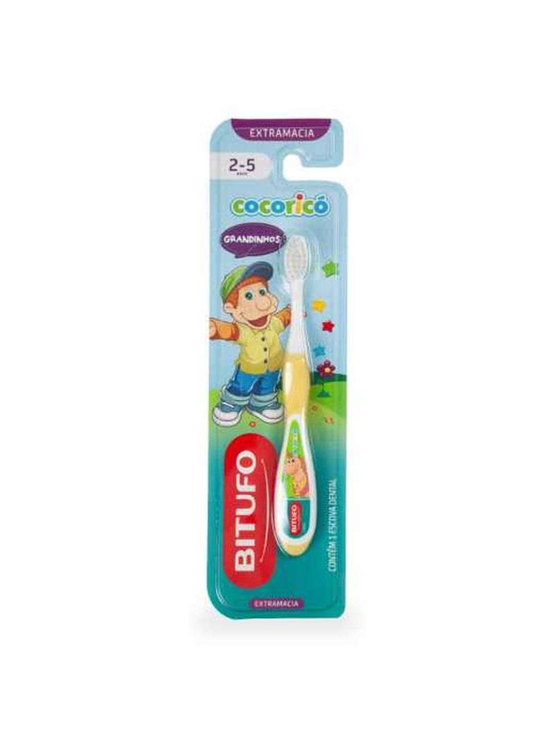 Bitufo Cocoricó Grandinhos É Uma Escova Dental Desenvolvida Especialmente para Crianças entre 2 a 5 Anos de Idade. É Uma Escova com Cabo Anatômico, Acabamento Arredondado, Cabeça Pequena e Cerdas Ultramacias, Perfeita para Tornar a Escovação das Crianças Um Momento Prazeroso e Confortável.