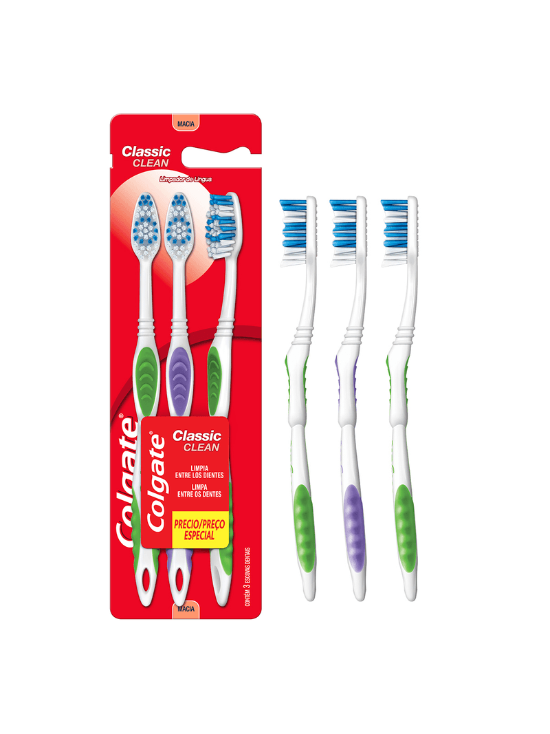 A escova dental Colgate Classic Clean garante uma higienização profunda e completa. Cerdas macias Suas cerdas em formato "V" tem profundo alcance para uma melhor limpeza entre os dentes O limpador de língua promove a remoção das bactérias causadoras de mau hálito. Cores sortidas