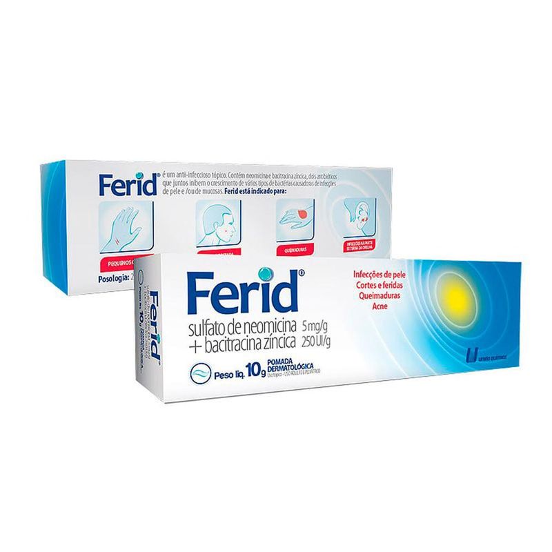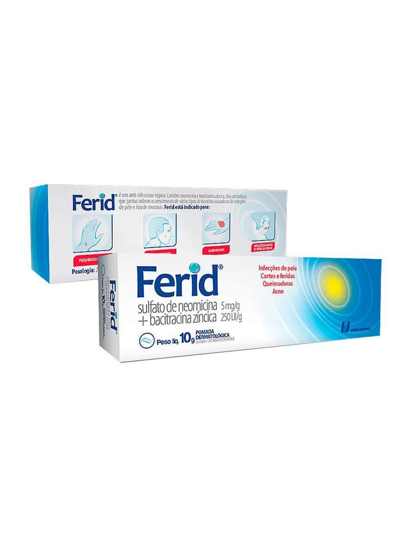 Como funciona? Ferid contém dois antibióticos, a neomicina e a bacitracina zíncica, que juntos inibem o crescimento de vários tipos de bactérias, principalmente as que costumam causar infecções de pele e de mucosas. Por isto, Ferid é eficaz para tratar e para prevenir infecções de pele e de mucosas. Os efeitos do Ferid começam logo após sua aplicação. Na maioria dos casos, pode-se observar a melhora da lesão cerca de dois ou três dias após o início do tratamento. Contudo, a resposta ao tratamento depende, dentre outros fatores, do tamanho e tipo da lesão e da defesa do organismo do paciente. Caso não seja observada uma melhora, informe seu médico.