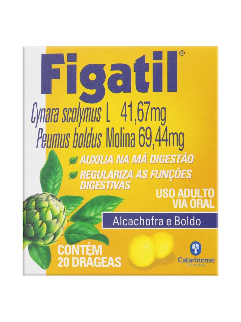 Figatil é um produto tradicional fitoterápico composto por plantas com reconhecidas propriedades digestivas. O boldo e a alcachofra apresentam propriedades coleréticas e colagogas que ajudam na digestão. O tempo médio de início da ação do medicamento é de cerca de 15 a 30 minutos. Exclusivo Drágea: Uma substância colerética estimula o fígado a aumentar a produção de bile. Ela aumenta a solubilidade do colesterol, das gorduras e das vitaminas (lipossolúveis), facilitando a sua absorção pelo organismo. Uma substância colagoga promove o fluxo da bile para o intestino, principalmente em virtude da contração da vesícula biliar. Drágea Uso oral. Os produtos tradicionais fitoterápicos não devem ser administrados pelas vias injetável e oftálmica. Ingerir 2 drágeas 1 a 6 vezes ao dia. A dose em 2 drágeas do produto é de 1,75 mg de derivados cafeoilquínicos expressos em ácido clorogênico e 0,25 mg de alcaloides totais expressos em boldina. A dose máxima deverá ser de 12 drágeas ao dia, dividida em 6 doses. Este produto não deve ser partido, aberto ou mastigado. Este produto não deve ser cortado. Siga corretamente o modo de usar. Em caso de dúvidas sobre este produto, procure orientação do farmacêutico ou profissional de saúde. Não desaparecendo os sintomas, procure orientação de seu profissional de saúde. Solução oral Este medicamento não deve ser utilizado por via de administração não recomendada. A solução oral e a solução oral concentrada devem ser ingeridas por via oral. A posologia do Figatil solução oral concentrada (diluir em água) foi estabelecida como 1 colher de chá (5mL),1 a 6 vezes ao dia. A posologia em mL do produto por peso corpóreo é de 0,4mL/kg/dia. Adose máxima deste medicamento deverá ser 6 colheres de chá (30mL) ao dia, dividida em 6 doses. A posologia do Figatil solução oral foi estabelecida como 1 flaconete (10mL), 1 a 6 vezes ao dia. A posologia em mL do produto por peso corpóreo é de 0,8mL/kg/dia. Adose máxima deste medicamento deverá ser 6 flaconetes (60mL) ao dia, dividida em 6 doses. Assim como todos os medicamentos, informe ao seu profissional da saúde todas as plantas medicinais e fitoterápicos que estiver tomando. Interações podem ocorrer entre medicamentos e plantas medicinais e mesmo entre duas plantas medicinais quando administradas ao mesmo tempo. Siga corretamente o modo de usar. Em caso de dúvidas sobre este medicamento, procure orientação do farmacêutico. Não desaparecendo os sintomas, procure orientação de seu médico ou cirurgião-dentista. Nomenclatura popular: Alcachofra. Boldo, Boldo do Chile. Nomenclatura botânica completa: Cynara scolymus L. Peumus boldus Molina. Família: Compositae. Monimiaceae. Parte da planta utilizada: Folhas. Folhas. Drágea Cada drágea contém: Extrato hidroetanólico seco (3:1) de folhas de Cynara scolymus L 41,67 mg (padronizado em 21,0 mg/g de derivados de ácido cafeoilquínico expressos em ácido clorogênico), equivalente a 0,875 mg de derivados cafeoilquínicos expressos em ácido clorogênico/drágea Extrato hidroetanólico seco (3:1) de folhas de Peumus boldus 69,44 mg (padronizado em 1,8 mg/g de alcaloides totais expressos em boldina), equivalente a 0,125 mg de alcaloides totais expressos em boldina/drágea Excipientes: amido, sacarose, estearato de magnésio, talco, carbonato de cálcio, goma arábica, anilina amarela tartrazina, cera de carnaúba e ácido esteárico. Solução oral concentrada Cada colher de chá (5 mL) do produto contém: Extrato fluido de alcachofra [Cynara scobymus L., equivalente a 0,21% ou 1,75mg de derivados cafeoilquínicos em ácido clorogênico (marcador)] 0,8335mL Extrato fluido de boldo [Peumus boldus Molina, equivalente a 0,03% ou 0,25mg de alcalóides totais em boldina (marcador) 0,8335mL Excipientes: sacarose, metilparabeno, óleo de laranja, sacarina sódica, hidróxido de sódio 50% e água purificada. Solução oral Cada flaconete (10 mL) contém Extrato fludo de alcachofra [Cynara scolymus L., equivalente a 0,21% ou 1,75mg de derivados cafeoilquínicos em ácido clorogênico (marcador)] 0,8335mL Extrato fluido de boldo (Peumus boldus Molina, equivalente a 0,03% ou 0,25mg de alcalóides totais em boldina (marcador)] 0,8335mL Excipientes: sacarose, propilenoglicol, metilparabeno,óleo de laranja, sacarina sódica, hidróxido de sódio 50% e água purificada. 1 mL equivale a 20 gotas. 1 gota contém 0,02mg de princípios ativos. Conservar este produto em sua embalagem original em temperatura ambiente (temperatura entre 15 a 30ºC). O produto apresenta validade de 24 meses. Número de lote e datas de fabricação e validade: vide embalagem. Não use medicamento com o prazo de validade vencido. Guarde-o em sua embalagem original. Exclusivo Solução oral: Após a abertura da embalagem, o produto deve ser guardado adequadamente para se manter próprio ao consumo dentro do prazo de validade. Características do medicamento Drágea O produto Figatil drágeas apresenta-se como drágea lisa com brilho de cor amarela. Solução oral 150 mL O produto Figatil apresenta-se como um líquido móvel, de cor castanho avermelhado e com odor de laranja e boldo. Seu sabor é amargo, levemente adocicado e picante. Solução oral 10 mL O produto Figatil apresenta-se como um líquido móvel, de cor castanho a castanho avermelhado e com odor de laranja e boldo. Seu sabor é amargo, levemente adocicado e picante. Antes de usar, observe o aspecto do medicamento. Caso ele esteja no prazo de validade e você observe alguma mudança no aspecto, consulte o farmacêutico para saber se poderá utilizá-lo. Todo medicamento deve ser mantido fora do alcance das crianças. Produto tradicional fitoterápico. Drágeas 41,670 mg + 69,440 mg Cartucho contendo 5 envelopes com 4 drágeas cada. Cada drágea de 440 mg contém 41,67 mg de extrato hidroetanólico seco (3:1) de folhas de alcachofra e 69,44 mg de extrato hidroetanólico seco (3:1) 