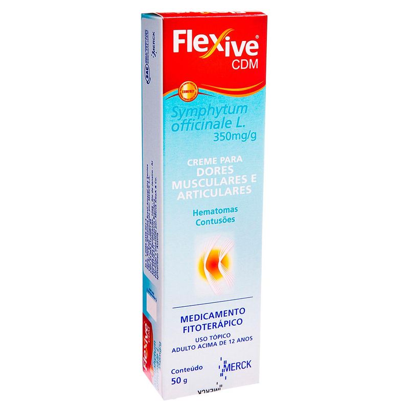 O princípio ativo do Flexive CDM é o extrato de raiz de Confrei (Symphytum officinale), que possui ação anti-inflamatória e analgésica, agindo sobre a região inflamada aliviando o inchaço e a dor. Aplique Flexive CDM nas áreas do corpo a serem tratadas, massageando-as vigorosamente até absorção completa. Caso não haja indicação em contrário, e dependendo da área do corpo a ser tratada e da gravidade dos sintomas, aplicar uma quantidade de creme de 2-6 cm de comprimento, duas a quatro vezes ao dia. Para queixas mais graves, pode ser utilizado um curativo com o produto. Para isso, aplicar 10 a 20 g de Flexive CDM uma vez por dia, cobrindo-se com um curativo apropriado. A aplicação pode ser mantida até que os sintomas regridam ou conforme indicado pelo seu médico. Siga corretamente o modo de usar. Em caso de dúvidas sobre este medicamento, procure orientação do farmacêutico. Não desaparecendo os sintomas, procure orientação de seu médico ou cirurgião-dentista. Cada grama contém: 350 mg de Extrato hidroalcoólico de raiz de Symphytum officinale L. (Contém 0,2 - 0,5% de alantoína). Excipientes: Fenonip, álcool cetoestearílico, monoestearato de glicerila, laurilsulfato de sódio, óleo de amendoim refinado, óleo de lavanda, óleo de pinheiro, óleo de perfume, água purificada. Nomenclatura botânica: Symphytum officinale L. (Boraginaceae). Nomenclatura vulgar: Confrei. Parte utilizada: raiz. Você deve conservar Flexive CDM em temperatura ambiente (entre 15°C e 30°C). Número de lote e datas de fabricação e validade: vide embalagem. Não use medicamento com o prazo de validade vencido. Guarde-o em sua embalagem original. Características do medicamento Flexive CDM é um creme de cor bege claro, com odor suave, característico. Antes de usar, observe o aspecto do medicamento. Caso ele esteja no prazo de validade e você observe alguma mudança no aspecto, consulte o farmacêutico para saber se poderá utilizá-lo. Todo medicamento deve ser mantido fora do alcance das crianças. Creme dermatológico Embalagens contendo 25 e 50 g. Uso tópico. Uso adulto e pediátrico acima de 12 anos. Medicamento fitoterápico.