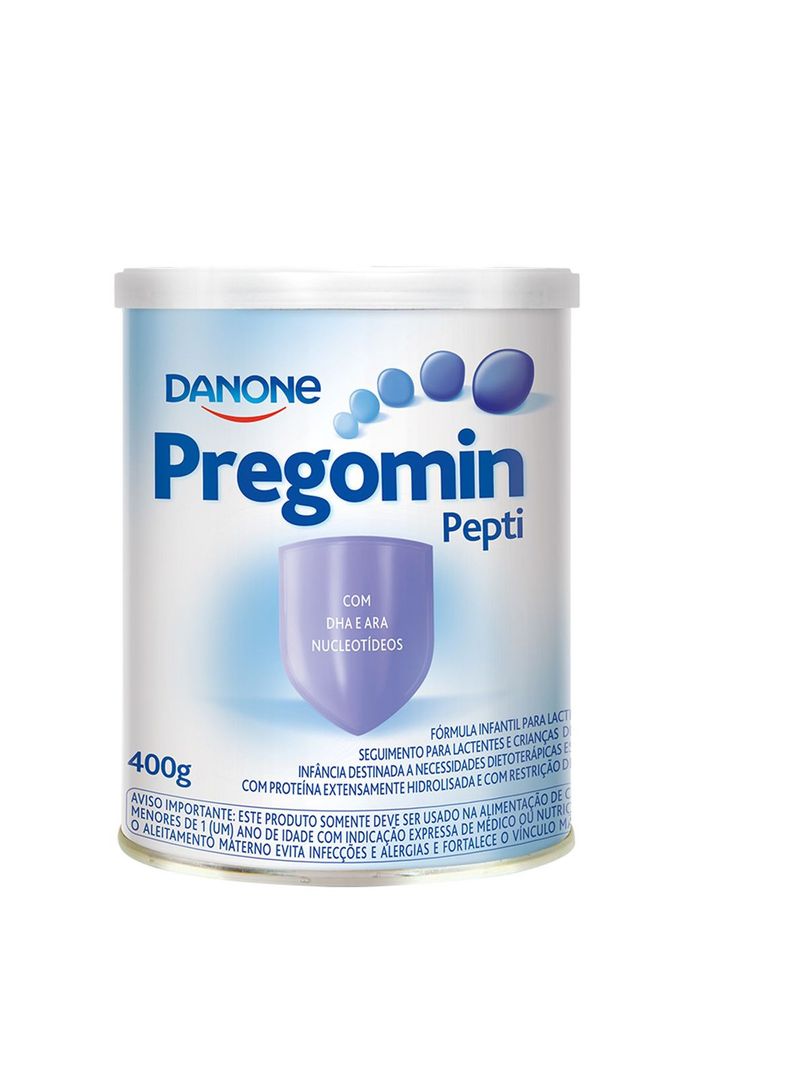 Fórmula Infantil para lactentes e de seguimento para lactentes e crianças de primeira infância destinadas a necessidades dietoterápicas específicas com proteína extensamente hidrolisada e com restrição de lactose Pregomin é uma fórmula infantil para lactentes e de seguimento para lactentes e crianças de primeira infância destinada a necessidades dietoterápicas específicas com proteína láctea extensamente hidrolisada e com restrição de lactose, com DHA e ARA, e nucleotídeos.Preparação:1 Lave as mãos, a mamadeira, o bico e o anel até remover todos os resíduos de fórmula. Ferva os utensílios durante 5 minutos. Conserve-os tampados até o momento de usá-los.2. Ferva a água potável durante 5 minutos e deixe resfriar por cerca de 15 minutos até atingir a temperatura de 70ºC. O uso de água e mamadeiras não fervidas pode provocar doenças ao lactente.3. Coloque na mamadeira esterilizada a quantidade exata de água previamente fervida.4. Sempre utilize a colher-medida contida nesta embalagem. Encha a colher-medida e nivele-a com o auxílio de uma faca limpa e seca.5. Adicione a quantidade de colheres-medida de acordo com a orientação do médico ou nutricionista ou de acordo com a tabela de alimentação. Siga rigorosamente a orientação quanto ao número de colheres-medida, pois a adição de mais ou menos colheres-medida pode ser prejudicial à saúde do lactente.6. Feche a mamadeira e agite-a até que o pó se dissolva completamente. Mexa ou agite a fórmula antes de oferecer ao lactente.7. Verifique a temperatura do produto no pulso antes de oferecer ao lactente a fim de evitar queimaduras. 8. O CONSUMO DO PRODUTO APTAMIL 1 DEVE SER IMEDIATO APÓS O PREPARO. Quando necessário o preparo do produto com antecedência, o mesmo deve ser mantido sob refrigeração a uma temperatura menor que 5ºC, por no máximo 24 horas. 9. Os restos do produto preparado devem ser descartados10. O preparo, o armazenamento e o uso inadequados deste produto podem trazer perigos à saúde do lactente.Cuidados de Conservação: Conservar em local seco e fresco. Após aberto: não refrigerar, conservar a lata bem fechada em local seco e fresco e consumir em até 30 dias. Utilizar sempre talheres limpos e secos.Não consuma o produto se o lacre metálico estiver violado. DHA E ARANUCLEOTÍDEOSAVISO IMPORTANTE: ESTE PRODUTO SOMENTE DEVE SER USADO NA ALIMENTAÇÃO DE CRIANÇAS MENORES DE 1 (UM) ANO DE IDADE COM INDICAÇÃO EXPRESSA DE MÉDICO OU NUTRICIONISTA. O ALEITAMENTO MATERNO EVITA INFECÇÕES E ALERGIAS E FORTALECE O VÍNCULO MÃE-FILHO.O MINISTÉRIO DA SAÚDE INFORMA: O ALEITAMENTO MATERNO EVITA INFECÇÕES E ALERGIAS E É RECOMENDADO ATÉ OS 2 (DOIS) ANOS DE IDADE OU MAIS