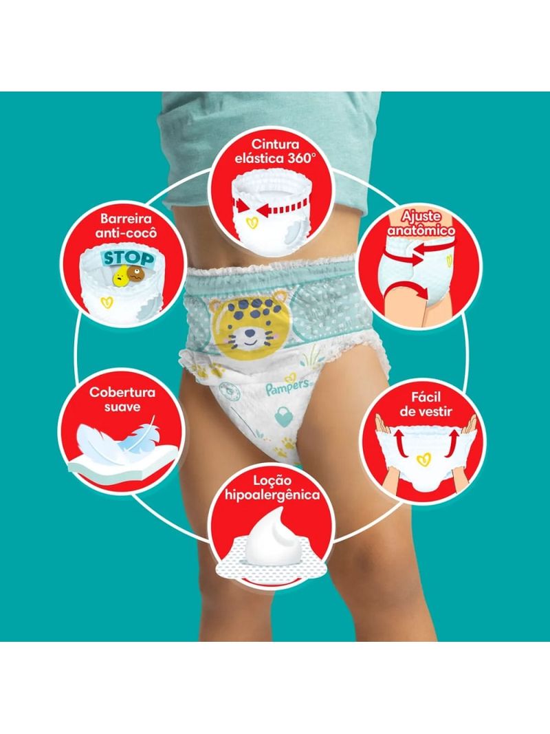 até 3x de R$ 48,41A Pampers Pants Ajuste Total é uma fralda descartável desenvolvida para oferecer máximo conforto e praticidade. Com cintura elástica 360 graus, ela se ajusta perfeitamente ao corpo do bebê, garantindo liberdade de movimento e evitando vazamentos. Além disso, é fácil de vestir e remover, funcionando como uma calcinha ou cueca, sem necessidade de fitas adesivas laterais.