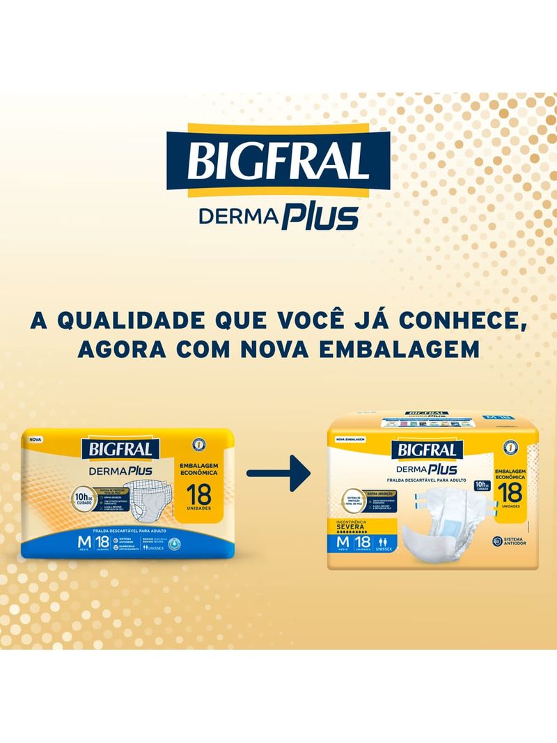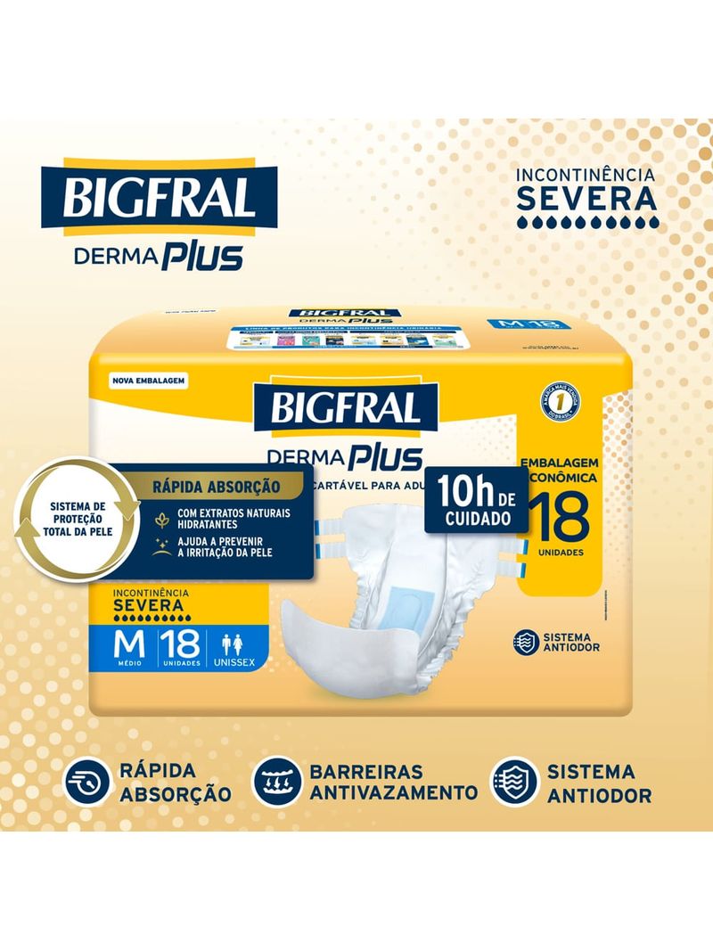 A Bigfral Dermaplus M foi projetada para oferecer máxima absorção e conforto em situações de incontinência severa. Possui camada interna macia, cintura elástica e formato anatômico que proporcionam melhor ajuste ao corpo, além de barreiras antivazamento que garantem total proteção. O pacote com 18 unidades é perfeito para quem busca praticidade e economia no cuidado diário.