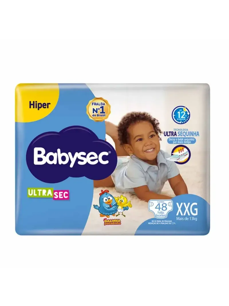 Fralda Descartável Babysec UltraSec Hiper pensada exclusivamente no conforto do bebê e na tranquilidade da mãe na prevenção de vazamentos indesejados e irritação da pele.