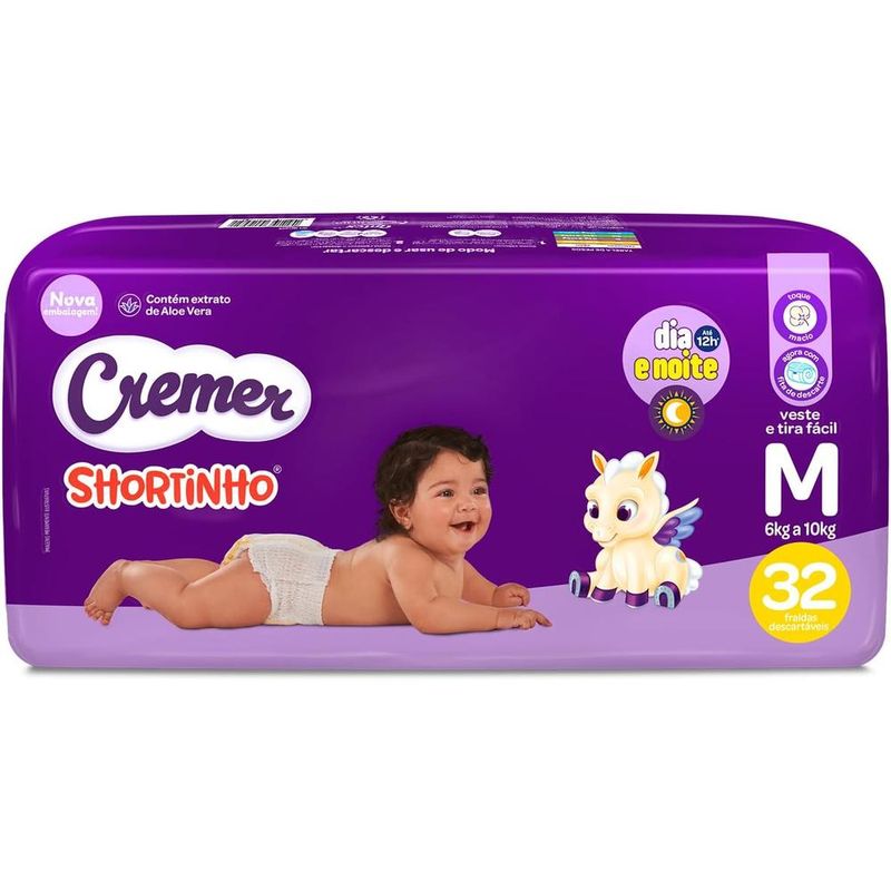 A nova Cremer Shortinho traz ainda mais praticidade para o dia a dia, além de proporcionar até 12h de proteção sem vazamentos, deixando o bebê ainda mais sequinho. Veste como uma calcinha ou cuequinha devido a sua cintura elástica e seu ajuste seguro que se adapta ao corpinho de bebê, e conta com uma cobertura fresca que deixa a pele do bebê sequinha e arejada, liberando calor e umidade. Feita com carinho e pensando no seu bebê cada fraldinha, diferenciando o tamanho de cada Cremer Shortinho. Acompanhamos o desenvolvimento do seu bebê, confira os tamanhos indicados na tabelinha de peso presente nas fotos do anúncios. Cremer Shortinho Proteção para noites tranquilas e dias mágicos. Como colocar: Coloque a fralda-calça Cremer em seu bebê como se fosse uma calcinha ou cuequinha. Certifique-se que a fita adesiva ficará no lado de trás, nas costas do bebê. Como remover: Rasgue as costuras laterais e retire como uma fralda comum. Como descartar: Faça um rolinho começando pela parte da frente. Puxe a fita que está na parte de trás da fralda e enrole-a. Após enrolada, jogue-a no lixo. Nunca jogue as fraldas no vaso sanitário.