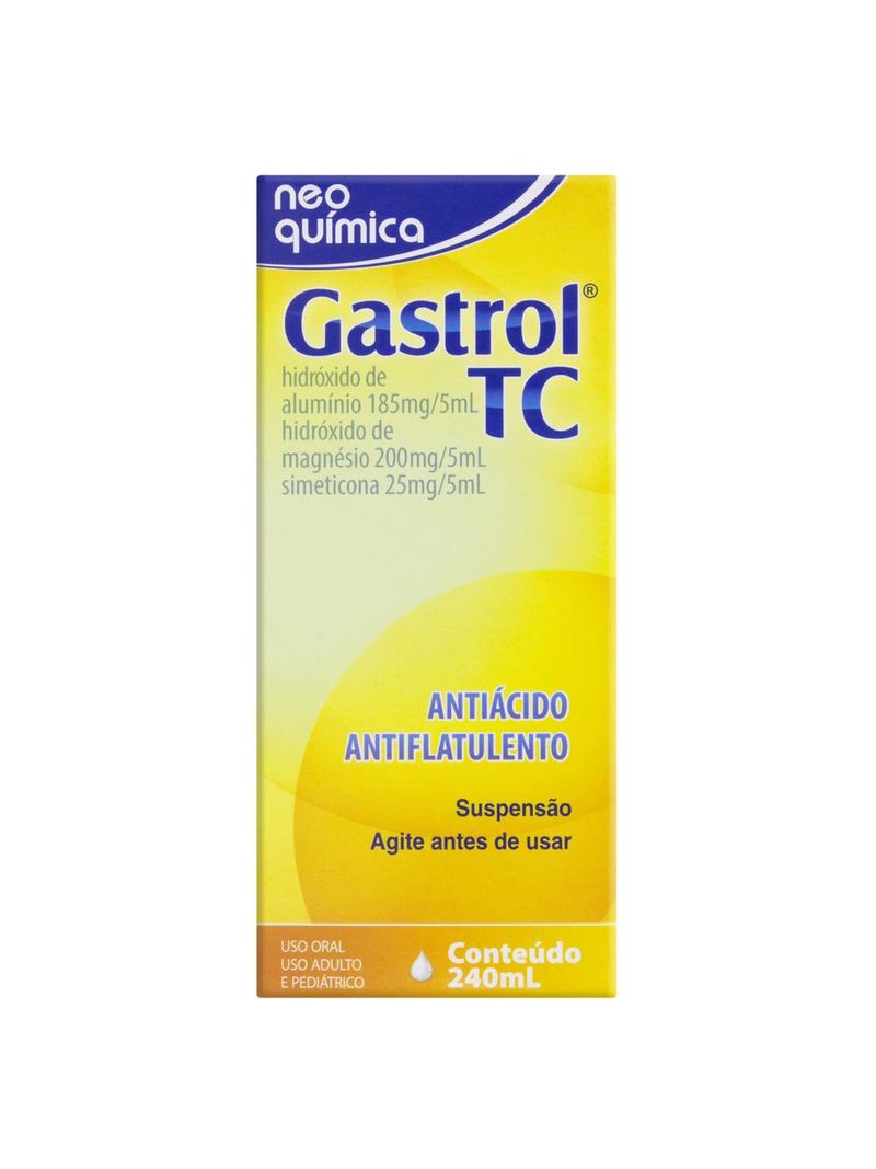 Gastrol TC é uma formulação com propriedades antiácidas e antiflatulentas, pois contém hidróxido de alumínio, hidróxido de magnésio e simeticona. O hidróxido de alumínio e o hidróxido de magnésio neutralizam a acidez gástrica (do estômago) e a simeticona, um polímero de sílica, é importante no tratamento da aerofagia (ingestão de ar), promovendo a eliminação dos gases excessivos acumulados no trato gastrintestinal (trato digestivo), que contribuem para o aumento da acidez local. Suspensão oral Uso oral. Gastrol TC deve ser ingerido de 30 minutos a 1 hora antes ou após as refeições, ou ao deitar-se, ou ainda segundo recomendações médicas. A administração de Gastrol TC pode ser: Crianças 1 colher de chá, 1 a 2 vezes ao dia. Dose máxima diária: 2 colheres de chá ou 10mL. Adultos 1 a 2 colheres de sobremesa, 4 vezes ao dia. Dose máxima diária: 8 colheres de sobremesa ou 80mL. Cada colher de chá corresponde a 5mL, enquanto que a de sobremesa corresponde a 10mL. Não ultrapassar as doses recomendadas ou prolongar o tratamento por mais de 14 dias (com a dose máxima diária), exceto sob orientação médica. Siga corretamente o modo de usar. Em caso de dúvidas sobre este medicamento, procure orientação do farmacêutico. Não desaparecendo os sintomas, procure orientação de seu médico ou cirurgião-dentista. Comprimido Uso oral. Os comprimidos de Gastrol TC devem ser bem mastigados, de 30 minutos a 1 hora antes ou após as refeições, ou ao deitar-se, ou ainda segundo recomendações médicas. Os comprimidos mastigáveis não devem ser engolidos (deglutidos) inteiros. Não ultrapassar as doses recomendadas ou prolongar o tratamento por mais de 14 dias (com a dose máxima diária), exceto sob recomendação médica. A administração de Gastrol TC pode ser: Crianças 1 a 2 comprimidos mastigáveis ao dia. Dose máxima diária: 2 comprimidos mastigáveis. Adultos 2 a 4 comprimidos mastigáveis, 4 vezes ao dia. Dose máxima diária: 16 comprimidos mastigáveis. Siga corretamente o modo de usar. Em caso de dúvidas sobre este medicamento, procure orientação do farmacêutico. Não desaparecendo os sintomas, procure orientação de seu médico ou cirurgião-dentista. Suspensão oral Cada 5mL da suspensão contém: Hidróxido de alumínio 185mg Hidróxido de magnésio 200mg Simeticona 25mg Veículo q.s.p 5mL Veículo: ácido cítrico, metilparabeno, propilparabeno, óleo de menta, propilenoglicol, sacarina sódica, sorbitol, goma guar, peróxido de hidrogênio e água. Comprimido Cada comprimido mastigável contém: Hidróxido de alumínio 153mg Hidróxido de magnésio 200mg Simeticona 25mg Excipientes q.s.p 1 comprimido mastigável Excipientes: aroma de abacaxi, sorbitol, isomaltulose, aroma de menta piperita, povidona, estearato de magnésio, manitol e dióxido de silício. Conservar em temperatura ambiente (entre 15 e 30°C). Proteger da luz e umidade. Número de lote e datas de fabricação e validade: vide embalagem. Não use medicamento com o prazo de validade vencido. Guarde-o em sua embalagem original. Características do medicamento Suspensão oral Gastrol TC apresenta-se como suspensão viscosa, branca, isenta de partículas estranhas visíveis, odor e sabor agradáveis. Comprimido Gastrol TC apresenta-se como comprimido mastigável, circular, branco, isento de manchas e defeitos, com odor e sabor agradáveis. Antes de usar, observe o aspecto do medicamento. Caso ele esteja no prazo de validade e você observe alguma mudança no aspecto, consulte o farmacêutico para saber se poderá utilizá-lo. Todo medicamento deve ser mantido fora do alcance das crianças. Suspensão oral 185mg/5mL + 200mg/5mL + 25mg/5mL Embalagem contendo 1 frasco com 240mL. Via de administração: oral. Uso adulto e pediátrico. Comprimido mastigável 153mg + 200mg + 25mg Embalagem contendo 30 comprimidos mastigáveis. Via de administração: oral. Uso adulto e pediátrico.