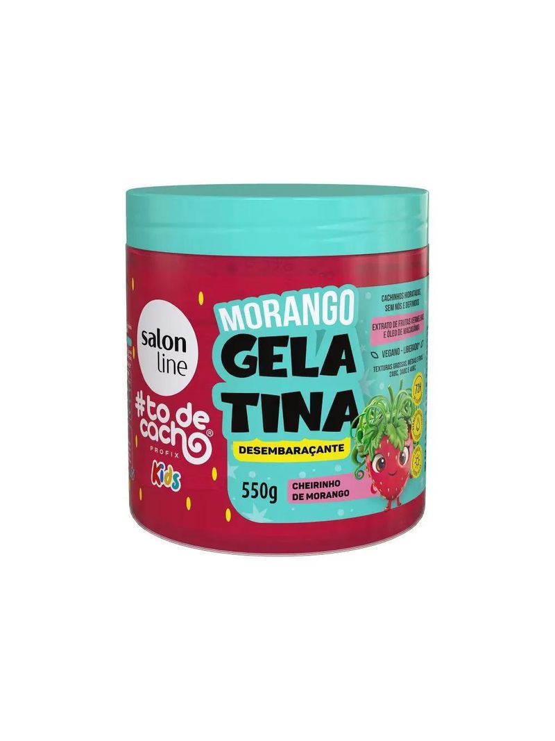 A Gelatina Desembaraçante #todecacho Kids Morango, além do cheirinho docinho de morango, proporciona desembaraço, hidratação, definição com fixação leve, brilho e controle de frizz. É dermatologicamente testada e contém filtro solar. INDICAÇÕES$& Para quais tipos de cabelo?Cabelos ondulados, cacheados e crespos de texturas grossas, médias e finas. Qual a indicação?Cabelos desidratados e sem definição. Pode usar a partir de quantos anos?A partir de 3 anos. ATIVOS$&Quais os principais ativos? Com manteiga de cacau, pantenol e óleo de coco, ativos com propriedades nutritivas, emolientes e umectantes e que proporcionam brilho, maciez e hidratação, deixando as ondinhas, os cachinhos e os crespinhos sedosos e sem frizz. MODO DE USO$&Qual a melhor forma de usar? Com os cabelos limpos e úmidos, aplique a Gelatina #TODECACHO KIDS mecha a mecha, uniformemente, no comprimento e pontas. Desembarace os fios com um pente de dentes largos e, em seguida, amasse-os, iniciando o movimento das pontas até a raiz. Repita o movimento quantas vezes forem necessárias. É indicado o uso de até 30g para finalização e penteados. A quantidade pode variar de acordo com o comprimento e o volume de cabelo. Não enxágue. CARACTERÍSTICAS$&É produto vegano?A Gelatina Desembaraçante #todecacho Kids Morango é vegana. É liberado?A Gelatina Desembaraçante #todecacho Kids Morango não é liberada.