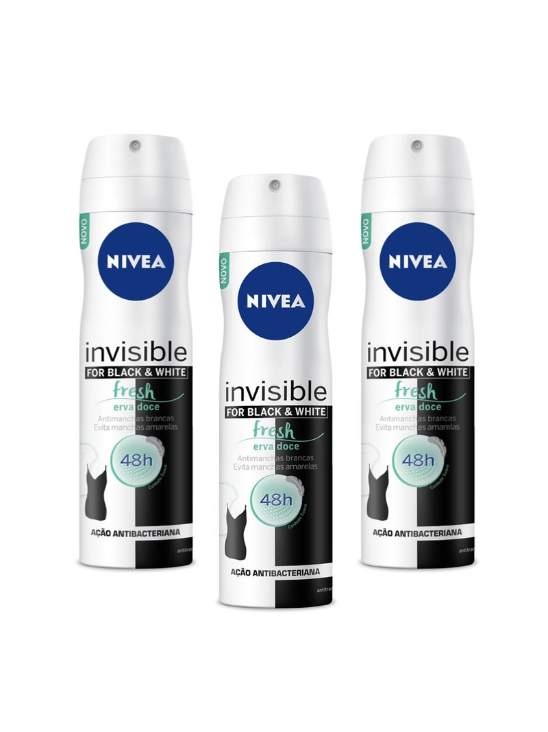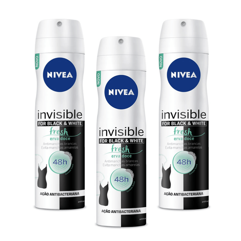 A composição também inclui uma fragrância com toque de erva-doce para uma sensação de frescor duradoura. Finalidade Desodorante Antitranspirante Nivea Black & White Invisible Fresh? Este desodorante serve para oferecer proteção completa e confiável contra o suor excessivo e o mau odor nas axilas por até 48 horas. Sua principal vantagem é a tecnologia antimanchas, que protege suas roupas pretas de manchas brancas e suas roupas brancas de manchas amareladas, permitindo que você se sinta seguro e confortável em qualquer ocasião. Como devo usar o desodorante antitranspirante Nivea? Agite bem o frasco antes de usar. Aplique o opção diretamente nas axilas limpas e secas, mantendo uma distância de aproximadamente 15cm da pele. Espere o opção secar completamente antes de se vestir para garantir a máxima proteção e evitar resíduos nas roupas. Use diariamente ou conforme a necessidade. Quando não devo usar o Nivea Black & White Invisible Fresh: Não aplique sobre a pele irritada ou lesionada. Caso ocorra irritação ou sensibilidade no local da aplicação, suspenda o uso imediatamente e procure orientação médica. Evite o uso se você tiver alergia a qualquer um dos componentes da fórmula.