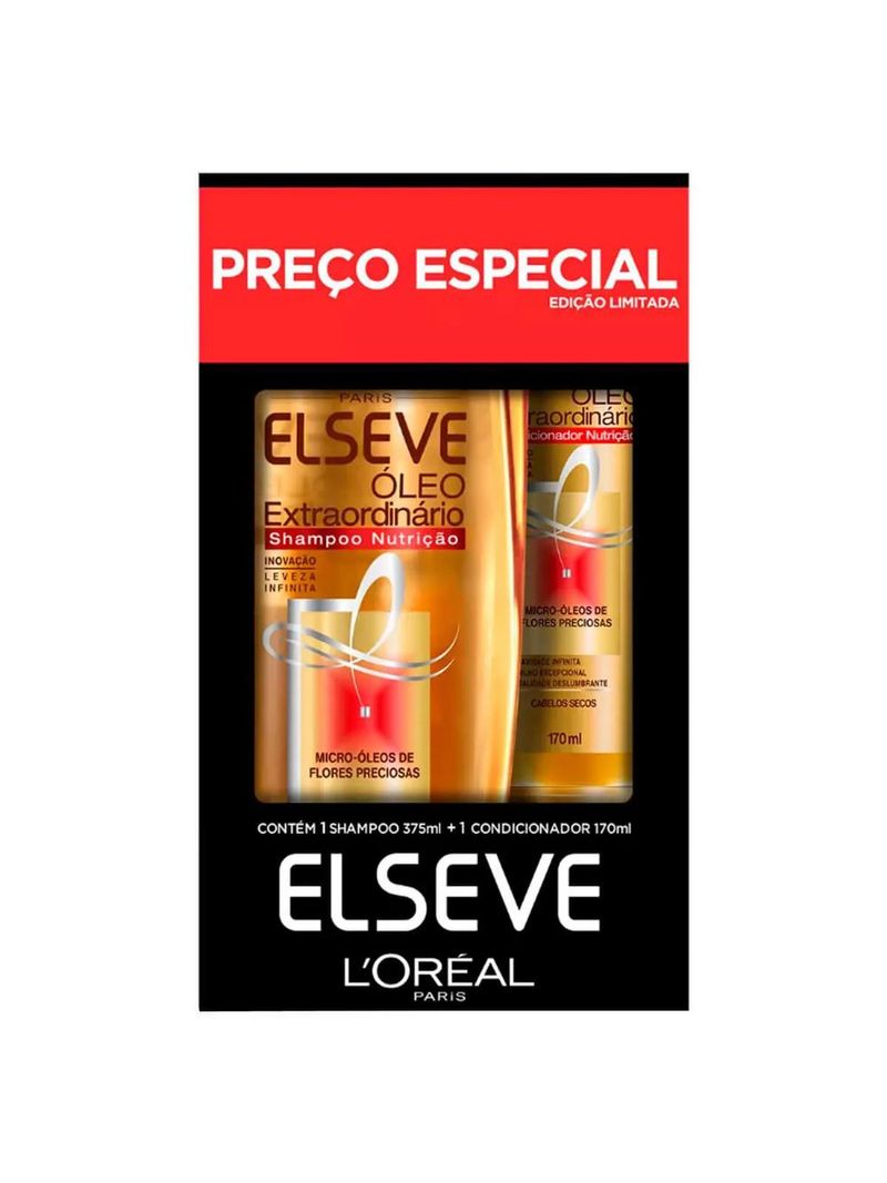 O que é e para que serve o Kit Elseve Óleo Extraordinário Nutrição? O Kit Elseve Óleo Extraordinário Nutrição é ideal para cabelos secos, opacos, sem brilho e com um toque áspero. O Shampoo e o condicionador devolvem leveza, brilho e vida aos cabelos. Kit contém: 1 Shampoo Elseve Óleo Extraordinário de 375ml. 1 Condicionador Elseve Óleo Extraordinário de 170ml. Benefícios do Kit Elseve Óleo Extraordinário Nutrição Tanto o Shampoo como o Condicionador da linha Elseve Óleo Extraordinário Nutrição: Contam com uma textura ultrafina e leve. São enriquecidos com Micro-Óleos de Flores Preciosas que agem para combater o cabelo seco e sem brilho. Agem na reconstrução da fibra, fazendo com que o cabelo tenha uma nutrição perfeita, leveza infinita e um brilho marcante. Como usar o Kit Elseve Óleo Extraordinário Nutrição? Aplique o Shampoo Óleo Extraordinário nos cabelos molhados e massageie suavemente. Enxágue totalmente e repita a operação se necessário. Aplique o Condicionador Óleo Extraordinário em todo o comprimento até as pontas. Deixe o produto agir por alguns minutos e enxágue abundantemente em seguida. Ingredientes Shampoo Elseve Óleo Extraordinário Nutrição Aqua/ Water, Sodium Laureth Sulfate, Coco-Betaine, Sodium Chloride, Glycerin, Propylene Glycol, CI 19140/ Yellow 5, Chamomilla Recutita Extract/ Matricaria Flower Extract, Cocos Nucifera Oil/ Coconut Oil, Sodium Benzoate, Sodium Hydroxide, PEG-60 Hydrogenated Castor Oil, Polyquaternium-10, Salicylic Acid, Helianthus Annus Seed Oil/ Sunflower Seed Oil, Nelumbium Speciosum Extract/ Nelumbium Speciosum Flower Extract, Linum Usitatissimum Flower Extract, Caprylic/ Capric Triglyceride, Caramel, Gardenia Tahitensis Flower Extract, Rosa Canina Flower Extract, Bisabolol, BHT, Citric Acid, Hexylene Glycol, Glycine Soja Oil/ Soybean Oil, Glyceryl Linoleate, Glyceryl Oleate, Glyceryl Linolenate, Parfum/ Fragrance. Condicionador Elseve Óleo Extraordinário Nutrição Aqua, Cetearyl Alcohol, Glycine Soja Oil/Soybean Oil, Behentrimonium Chloride, Ci 77891/Titanium Dioxide, Ci77491/Iron Oxides, Ci15985/Yellow 6, Ci19140/Yellow 5 , Chamomilla Recutita Extract/Matricaria Flower Extract, Mica, Cocos Nucifera Oil/Coconut Oil, Phenoxyethanol, Chlorhexidine Digluconate, Helianthus Annuus Seed Oil/Sunflower Seed Oil, Nelumbium Speciosum Extract/Nelumbium Speciosum Flower Extract, Linum Usitatissimum Flower Extract, Isopropyl Alcohol, Caprylic/Capric Triglyceride, Caramel, Gardenia Tahitensis Flower Extract, Rosa Canina Flower Extract, Bisabolol, Bht, Citric Acid, Glycerin, Glyceryl Linoleate, Glyceryl Oleate, Glyceryl Linolenate, Parfum/Fragrance (Code Fil: B171113/1). Advertências Uso externo. Não ingerir. Caso haja contato com os olhos, lave-os abundantemente. Se houver irritação, suspenda o uso imediatamente e procure orientação médica. Mantenha fora do alcance das crianças.