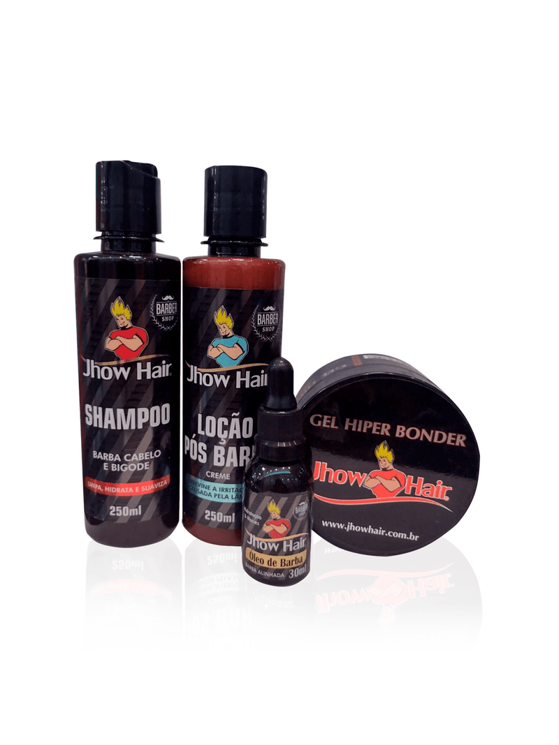 até 2x de R$ 33,99Kit Jhow Hair. Indicação: Para todos os tipos de cabelos e peles. Para os cuidados essências que um homem precisa ter para manter uma barba saudável, limpa, macia e com uma aparência atraente. Confira: Shampoo Barba, Cabelo e Bigode Foi criado para lavar a hidratar os pelos e cabelos mantendo uma sensação de limpeza por um longo período. Recomendações de Uso: Umedeça os pelos/cabelos e aplique o shampoo, massageie e em seguida enxague com água abundante. Loção Pós Barba Creme A loção proporciona uma deliciosa sensação refrescante à pele, deixando-a agradavelmente perfumada. Recomendações de Uso: Aplicar a loção nas mãos e passe suavemente na parte barbeada. Óleo de Barba Quanto mais longa a barba mais ela pode ressecar, por isso a Jhow Hair desenvolveu o Óleo de Barba, que quando utilizado na proporção correta hidrata a barba e a pele, deixando macia ao toque. Fácil de pentear, com uma sensação de limpeza com um aroma agradável. Recomendações de Uso: Depois de lavar a barba seque levemente a barba com a toalha. Aplique nas mãos uma quantidade suficiente para barba, espalhe óleo de barba da raiz as pontas, depois é só pentear e aguardar alguns minutos para a barba absorver o óleo deixando-a macia e perfumada. Gel Hiper Bonder Devolvido para quem, é exigente quando o assunto é fixação, o gel capilar Jhow Hair, promove uma fixação surpreendente desde a sua aplicação a secagem, modelando seus cabelos por muito mais tempo. Recomendações de Uso: Coloque uma quantidade suficiente em suas mãos, aplique nos cabelos limpos e úmidos. Pentear ao seu modo. Benefícios - Limpa, hidrata e suaviza; - Previne a irritação causada pela lâmina; - Barba alinhada; - Hidratação e maciez; - Ação prolongada; - Máxima fixação; Conteúdo: 1 Jhow Hair Shampoo Barba, Cabelo e Bigode 250ml + 1 Jhow Hair Loção Pós Barba Creme 250ml + 1 Jhow Hair Óleo de Barba 30ml + 1 Jhow Hair Gel Hiper Bonder 240g