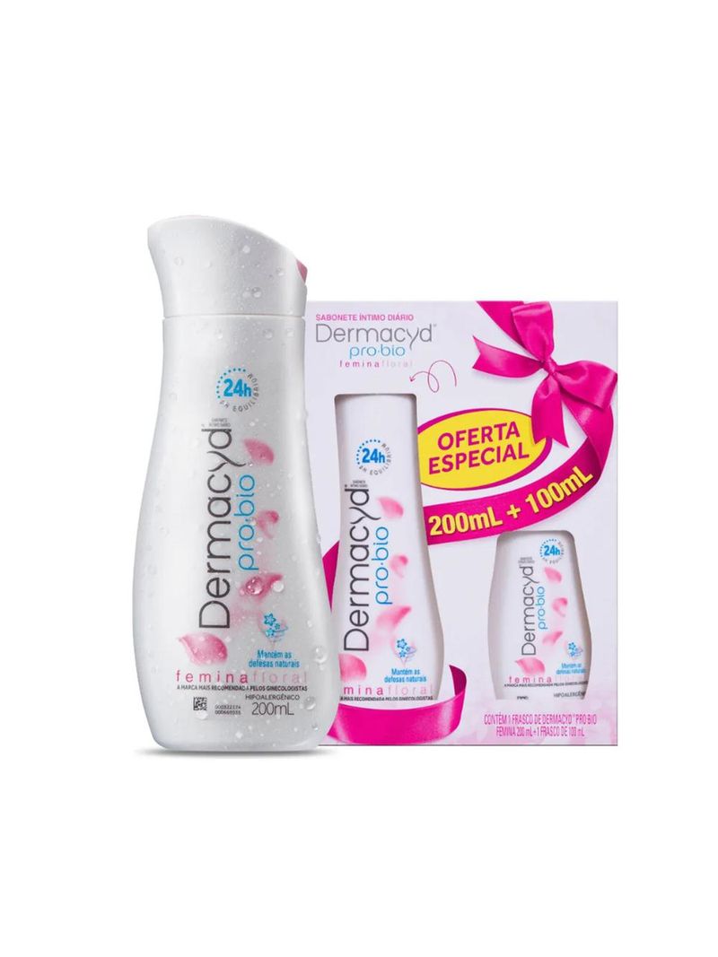 O que é e para que serve o Kit Sabonete Líquido Íntimo Dermacyd Femina floral? Dermacyd entende as necessidades e desafios da mulher moderna. Por isso, criou o Dermacyd Femina Floral, um sabonete líquido íntimo para você usar todos os dias. Ele é hipoalergênico (minimiza o surgimento de alergia e irritação) e é formulado com Ácido Lático e Lactoserum, ativos que limpam suavemente sem agredir a flora e que regulam o pH vaginal. Com Dermacyd Femina, você se sente protegida por 24h, com sensação de frescor e um cheirinho delicado de fragrância floral. É o melhor jeito de se sentir limpinha, confortável e com a área íntima bem cuidada, todos os dias. Marca recomendada por ginecologistas. O Kit contém: 1 Dermacyd com 200ml. 1 Dermacyd com 100ml. Diferenciais pH Equilibrado. Mantém defesas naturais. Hipoalergênico. Não agride a flora. Ajuda a prevenir odores. Proteção e frescor por 24 horas. Recomendado por dermatologistas. Como usar o Sabonete Líquido Íntimo Dermacyd Pro Bio Femina Floral? Agite antes de usar. Aplicar em pequena quantidade na região genital externa, até obter espuma. Em seguida, enxaguar abundantemente. Em dias de frio recomenda-se o uso uma vez ao dia, e no calor, até 3 vezes ao dia. Ingredientes Princípio Ativo Ácido Lático + Lactoserum Todos os Ingredientes Whey, Latic Acid, Alpha-Glucan Oligosaccharide, Acrylates Copolymer, Parfum, Hydroxyethylcellulose, Methyparaben, Phosphoric Acid, Sodium Hydroxide, Sodium Laureth, Sulfate, Glycol Distearate, Cocamide MEA, Laureth 10 E Aqua. Advertências Uso externo. Não ingerir. Caso haja contato com os olhos, lave-os abundantemente. Se houver alergia, suspenda o uso. Se persistir, procure orientação médica. Conservar em temperatura ambiente (entre 15ºC a 30ºC). Mantenha fora do alcance das crianças.