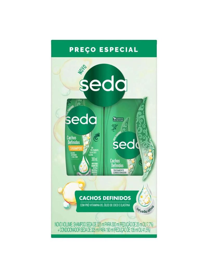 O que é e para que serve o Seda Cachos Definidos? Seda Cachos Definidos é uma linha de produtos que conta com tecnologia Nutri-Seladora, que nutre e sela as cutículas, fazendo com que seus cachos fiquem definidos e controlados. Formulada com uma poderosa combinação de vitamina, Óleo e Proteína, seu uso limpa e age profundamente na fibra capilar proporcionando cabelos mais saudáveis, bonitos e disciplinados. Como usar o Kit Seda Cachos Definidos Shampoo + condicionador? Shampoo Seda Cachos Definidos Aplique o Shampoo Seda nos cabelos molhados e massageie até formar espuma. Enxágue. Reaplique novamente se necessário. Condicionador Seda Cachos Definidos Após o uso do Shampoo Seda, aplique sobre todo o comprimento dos fios, até as pontas. Deixe agir por um minuto e enxágue. Composição Shampoo Seda Cachos Definidos Aqua, Sodium Laureth Sulfate, Sodium Chloride, Cocamidopropyl Betaine, Parfum, Sodium Benzoate, Glycol Distearate, Carbomer, Citric Acid, Guar Hydroxypropyltrimonium Chloride, Cocamide Mea, Disodium Edta, Mica, Titanium Dioxide, Cocos Nucifera Oil, Dimethiconol, Hydrolyzed Elastin, Sodium Hydroxide, Polysorbate 20, Ascorbic Acid, Panthenol, Tocopheryl Acetate, Biotin, Niacinamide, Benzyl Benzoate, Hexyl Cinnamal, Limonene, Linalool. Condicionador Seda Cachos Definidos Aqua, Cetearyl Alcohol, Behentrimonium Chloride, Dimethicone, Parfum, Amodimethicone, Disodium Edta, Cocos Nucifera Oil, Methylchloroisothiazolinone, Hydrolyzed Elastin, Methylisothiazolinone, Polysorbate 20, Ascorbic Acid, Panthenol, Tocopheryl Acetate, Biotin, Niacinamide, Benzyl Benzoate, Hexyl Cinnamal, Limonene, Linalool. Advertências Uso externo. Não ingerir. Caso haja contato com os olhos, lave-os abundantemente. Se houver irritação, suspenda o uso imediatamente e procure orientação médica. Mantenha fora do alcance das crianças.