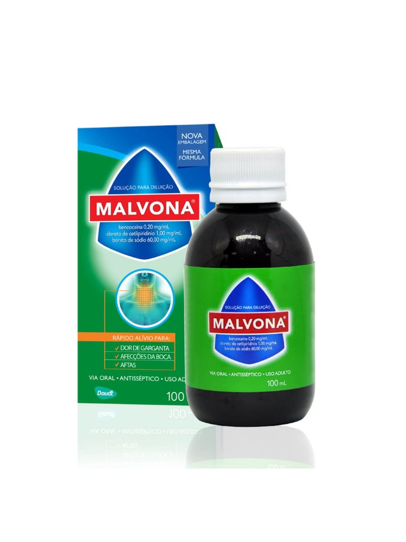 Malvona é um medicamento com propriedades antisséptica e anestésica, que atua na prevenção e tratamento das afecções da boca, gengiva e garganta. Malvona necessita ser diluída em água antes de seu uso. Agite bem antes de usar. Para uma melhor ação do produto, é aconselhável não comer ou beber durante 30 minutos após o uso de Malvona. Bochechos ou gargarejos Dilua uma colher de chá (5 mL) em um copo com 50 mL de água fria ou morna. Usar 4 a 5 vezes ao dia, ou de acordo com as instruções médicas ou odontológicas. No caso de aftas, se preferir, embeba um pedaço de algodão na solução e aplique diretamente sobre a lesão. Atenção: Malvona deve ser utilizada exclusivamente por via oral, através de bochechos ou gargarejos. Portanto, não deve ser ingerida. Malvona contém extratos naturais que podem ficar aparentes. Siga corretamente o modo de usar. Em caso de dúvidas sobre este medicamento, procure orientação do farmacêutico. Não desaparecendo os sintomas, procure orientação de seu médico ou cirurgião-dentista. Cada mL contém: Benzocaína 0,20 mg Borato de sódio 60,00 mg Cloreto de cetilpiridínio 1,00 mg Excipientes q.s.p. 1 mL Excipientes: álcool etílico, Malva sylvestris L. (extrato fluído), fenosalil, mentol, sacarina sódica, sorbitol (solução a 70%), óleo essencial de Eucalyptus globulus, óleo essencial de menta e água purificada. Este produto contém álcool em sua composição (0,36 mL/mL). Malvona deve ser guardada em sua embalagem original, com o frasco bem fechado, em temperatura ambiente (entre 15°C e 30°C) e ao abrigo da luz solar. Número do lote e datas de fabricação e validade: vide embalagem. Não use medicamento com o prazo de validade vencido. Guarde-o em sua embalagem original. Antes de usar, observe o aspecto do medicamento. Caso ele esteja no prazo de validade e você observe alguma mudança no aspecto, consulte o farmacêutico para saber se poderá utilizá-lo. Todo medicamento deve ser mantido fora do alcance das crianças. Solução oral 0,20 mg/mL + 60,00 mg/mL + 1,00 mg/mL Frascos contendo 100 mL e 200 mL. Via oral. Uso adulto.