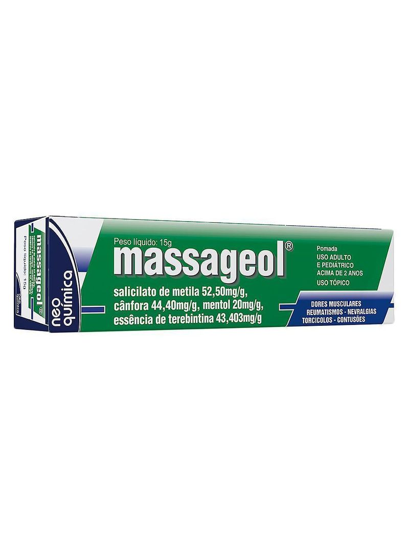 Este medicamento atua promovendo analgesia (redução da dor) e hiperemia (aumento da quantidade de sangue na superfície do local afetado) da pele, no local em que é aplicado; promove leve anestesia local, causada pela sensação de frio que promove após sua aplicação; age produzindo vasodilatação local, aliviando a dor nas estruturas profundas, que se apresentam inflamadas ou lesionadas. Os sinais de melhora nos sintomas podem ocorrer em um prazo variável de dias, após o início do tratamento. Pomada Deve-se friccionar a parte dolorida por alguns minutos e repetir de 2 a 3 vezes ao dia no máximo, até melhora da dor. Siga corretamente o modo de usar. Em caso de dúvidas sobre este medicamento, procure orientação do farmacêutico. Não desaparecendo os sintomas, procure orientação de seu médico ou cirurgião-dentista.  Solução aerossol Duas aplicações diárias sobre a região afetada, até melhora da dor. No momento de usar, evite inalação deste produto e proteja os olhos durante a aplicação. Aplicar no máximo 3 vezes ao dia. Siga corretamente o modo de usar. Em caso de dúvidas sobre este medicamento, procure orientação do farmacêutico. Não desaparecendo os sintomas, procure orientação de seu médico ou cirurgião-dentista. Cada grama da pomada contém: Salicilato de metila 52,50mg Cânfora 44,40mg Mentol 20,0mg Excipientes q.s.p 1,00g Excipientes: terebintina, parafina branca, petrolato líquido, petrolato branco e álcool etílico. Cada ml da solução aerossol contém: Salicilato de metila 0,0333ml Cânfora 0,0333g Mentol 0,0083g Veículo q.s.p 1,0ml Veículo: terebintina, essência de mostarda, essência de alfazema, álcool etílico e propelente (isobutano). Conservar em temperatura ambiente (entre 15 e 30°C). Proteger da luz e umidade. Exclusivo Solução aerossol: Conteúdo sob pressão. Inflamável. Não pulverizar perto do fogo. O vasilhame, mesmo vazio, não deve ser perfurado. Não use ou guarde em lugar quente, próximo a chamas ou exposto ao sol. Nunca coloque esta embalagem no fogo ou incinerador. Número de lote e datas de fabricação e validade: vide embalagem. Não use medicamento com o prazo de validade vencido. Guarde-o em sua embalagem original. Características físicas Pomada Massageol apresenta-se como uma pomada translúcida, oleosa e odor de canfôra/mentol. Solução aerossol Massageol apresenta-se como líquido incolor, amarelado a levemente esverdeado e odor característico. Antes de usar observe o aspecto do medicamento. Caso ele esteja no prazo de validade e você observe alguma mudança no aspecto, consulte o farmacêutico para saber se poderá utilizá-lo. Todo medicamento deve ser mantido fora do alcance das crianças. Pomada Embalagens contendo 1 bisnaga com 15g ou 30g. Via de administração: dermatológica. Uso adulto e pediátrico acima de 2 anos. Solução aerossol Embalagem contendo 1 frasco com 120ml (88g). Via de administração: dermatológica. Uso adulto e pediátrico acima de 2 anos.