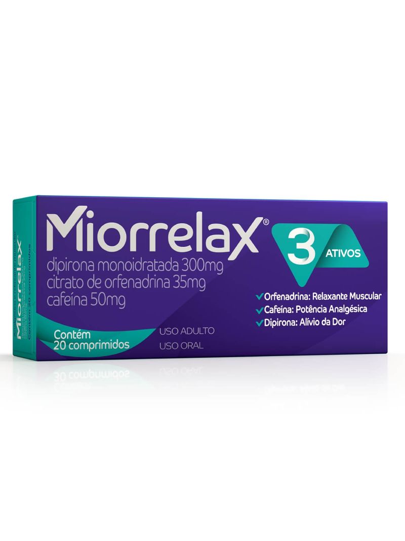 Miorrelax possui ação analgésica e relaxante muscular. O início da ação ocorre a partir de 30 minutos. Você deve tomar os comprimidos com líquido (aproximadamente ½ a 1 copo), por via oral. Posologia do Miorrelax 1 a 2 comprimidos, 3 a 4 vezes ao dia. Não ultrapassar estes limites. Não há estudos dos efeitos de Miorrelax administrado por vias não recomendadas. Portanto, por segurança e para eficácia deste medicamento, a administração deve ser somente pela via oral. Siga corretamente o modo de usar. Em caso de dúvidas sobre este medicamento, procure orientação do farmacêutico. Não desaparecendo os sintomas, procure orientação de seu médico ou cirurgião-dentista. Este medicamento não deve ser partido, aberto ou mastigado. Cada comprimido contém: Dipirona monoidratada 300mg Citrato de orfenadrina (equivalente a 20,4mg de orfenadrina) 35mg Cafeína 50mg Excipientes q.s.p 1 comprimido Excipientes: povidona, metabissulfito de sódio, amido, estearato de magnésio e dióxido de silício. Conservar em temperatura ambiente (entre 15 e 30ºC). Proteger da luz e umidade. Número de lote e datas de fabricação e validade: vide embalagem. Não use medicamento com o prazo de validade vencido. Guarde-o em sua embalagem original. Características do medicamento Miorrelax apresenta-se como comprimido circular, semiabaulado e branco a levemente amarelado. Antes de usar, observe o aspecto do medicamento. Caso ele esteja no prazo de validade e você observe alguma mudança no aspecto, consulte o farmacêutico para saber se poderá utilizá-lo. Todo medicamento deve ser mantido fora do alcance das crianças. Comprimido 300mg + 35mg + 50mg Embalagens contendo 20, 30 ou 200 comprimidos. Via de administração: oral. Uso adulto.