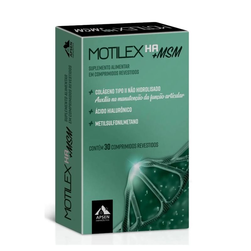 Motilex HA + MSM é um suplemento alimentar em cápsulas que contém em sua formulação fontes de ácido hialurônico e de colágeno tipo II não hidrolisado. O colágeno tipo II auxilia na manutenção da função articular. O ácido hialurônico via oral aumento a produção endógena este componente. Contém 30 comprimidos. Informações retiradas da bula.