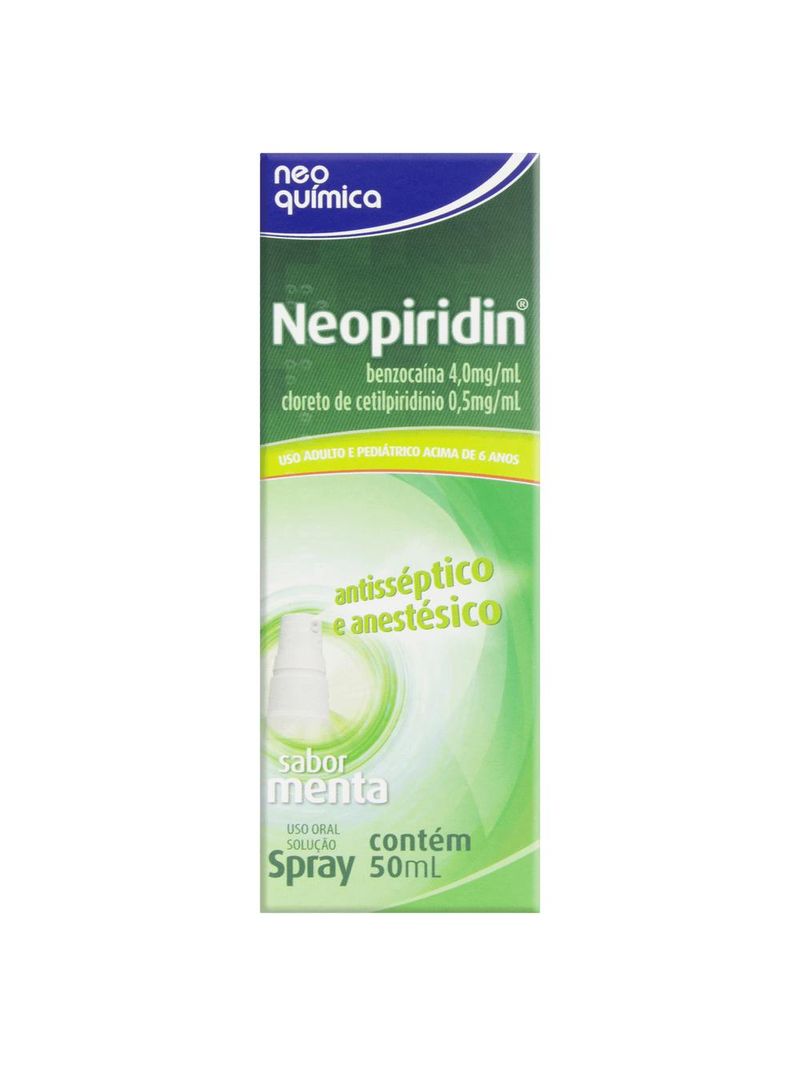 A benzocaína é um anestésico tópico útil no alívio das dores da boca e da garganta provenientes de faringites, amigdalites e outras afecções. E o cloreto de cetilpiridínio possui propriedade antisséptica (degrada ou inibe a proliferação de microrganismos presentes na pele e mucosas). Solução spray Antes da primeira utilização acionar a válvula 3 vezes para que haja saída do produto. Para adultos e crianças acima de 6 anos de idade Fazer 3 a 6 nebulizações na área afetada. Repetir o procedimento a cada 2 a 3 horas como necessário, até o máximo de 6 vezes ao dia. Neopiridin solução spray deve ser usado de acordo com a posologia acima, somente para uso na área afetada, não devendo ingerir-se o excesso. Para Neopiridin Solução spray segue o procedimento de limpeza descrito abaixo: Procedimento de Limpeza Após o uso, limpe cuidadosamente o orifício do atuador com um lenço de papel ou pano limpo e recoloque a tampa. Em caso de não funcionamento do spray, remova o atuador e mergulhe-o em água morna por alguns minutos, recoloque-o em seguida. Pressione o atuador sobre o frasco conforme necessário, até que um pulverizado seja obtido e use normalmente. Não há estudos dos efeitos de Neopiridin administrada por vias não recomendadas. Portanto, por segurança e para garantir a eficácia deste medicamento, a administração deve ser somente na via oral. Siga corretamente o modo de usar. Em caso de dúvidas sobre este medicamento, procure orientação do farmacêutico. Não desaparecendo os sintomas, procure orientação de seu médico ou cirurgião-dentista. Pastilha dura Uso oral. Para adultos e crianças acima de 6 anos Deixar dissolver na boca uma pastilha, de acordo com as necessidades, não excedendo a 6 pastilhas por dia, ou segundo critério médico. Não há estudos dos efeitos de Neopiridin pastilha administrada por vias não recomendadas. Portanto, por segurança e para garantir a eficácia deste medicamento, a administração deve ser somente na via oral. Siga corretamente o modo de usar. Em caso de dúvidas sobre este medicamento, procure orientação do farmacêutico. Não desaparecendo os sintomas, procure orientação de seu médico ou cirurgião-dentista. Este medicamento não deve ser partido ou mastigado. Cada mL de solução spray contém: Benzocaína 4mg Cloreto de cetilpiridínio 0,5mg Veículo q.s.p. 1mL Veículo: corante amarelo de tartrazina FD&C N° 5, metilparabeno, propilparabeno, álcool etílico, mentol, glicerol, polioxil 40, óleo de rícino hidrogenado (cremophor RH-40), corante azul FD&C N° 01, sorbitol, sacarose, água Cada pastilha dura contém: Benzocaína 10mg Cloreto de cetilpiridínio 1,466mg Excipientes q.s.p. 1 pastilha dura Excipientes: aroma de menta limão, corante amarelo de tartrazina FD&C N° 05, corante azul FD&C N° 02, talco, sacarose e glicose. Conservar em temperatura ambiente (entre 15 e 30°C). Proteger da luz. Exclusivo Pastilha dura: e umidade. Número de lote e datas de fabricação e validade: vide embalagem. Não use medicamento com o prazo de validade vencido. Guarde-o em sua embalagem original. Características do medicamento Solução spray Neopiridin spray apresenta-se como solução límpida e de cor verde. Pastilha dura Neopiridin apresenta-se como pastilhas de cor verde. Antes de usar, observe o aspecto do medicamento. Caso ele esteja no prazo de validade e você observe alguma mudança no aspecto, consulte o farmacêutico para saber se poderá utilizá-lo. Todo medicamento deve ser mantido fora do alcance das crianças. Solução spray 4mg/mL + 0,5mg/mL Embalagem contendo 50mL de solução spray. Via de administração: oral. Uso adulto e pediátrico acima de 6 anos. Pastilha dura 10mg + 1,466mg Embalagem contendo 12 pastilhas duras. Via de administração: oral. Uso adulto e pediátrico acima de 6 anos.