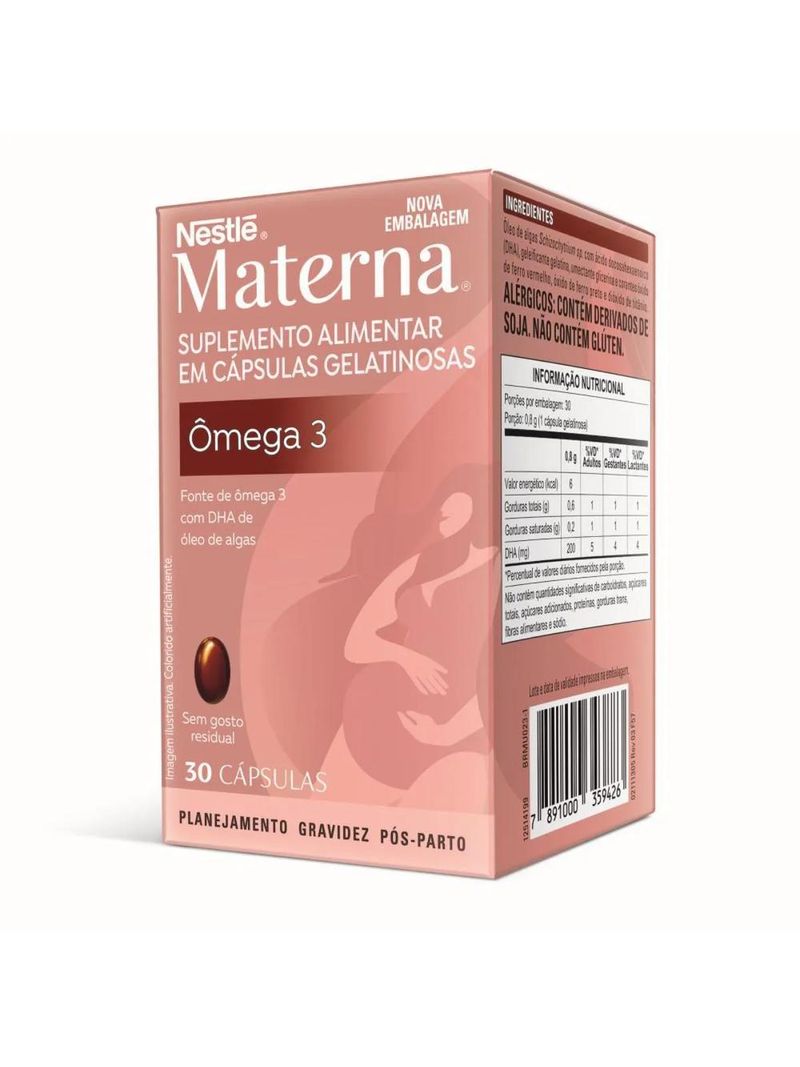 O que é o Nestlé Materna Ômega DHA? Nestlé Materna Ômega DHA é um suplemento alimentar em cápsulas gelatinosas com Ômega 3 DHA de óleo de alga e baixo teor de gorduras totais. Sem sabor residual, ele também não contém glúten e está disponível em embalagem com 30 cápsulas. Para que serve o Nestlé Materna Ômega DHA? Nestlé Materna é indicado para mulheres que planejam engravidar, gestantes e lactantes. Benefícios e diferenciais do Nestlé Materna Ômega DHA Suplemento alimentar em cápsulas gelatinosas. Contém Ômega 3 DHA de óleo de alga. Indicado para mulheres planejando engravidar, gestantes e lactantes. Fonte de Ômega 3 com baixo teor de gorduras totais. Sem sabor residual. Não contém glúten. Embalagem com 30 cápsulas. Como usar o Nestlé Materna Ômega DHA? É recomendável o uso de 1 cápsula gelatinosa por dia ou seguir as recomendações do seu médico/nutricionista. Ingredientes Óleo de algas Schizochytrium sp. com ácido docosahexaenoico (DHA), emulsificante lecitina, gelificante gelatina, umectante glicerina, espessante cera de abelha e corantes, óxido de ferro vermelho, óxido de ferro preto e dióxido de titânio. A lista de ingredientes usados na composição pode ser alterada pelo fabricante. Desta forma, recomendamos que você sempre leia a lista de ingredientes na embalagem do produto para garantir que são adequados para seu uso. Alérgicos CONTÉM DERIVADOS DE SOJA. NÃO CONTÉM GLÚTEN. Advertências Uso adulto. Este produto não é um medicamento. Conservar em local seco e arejado, protegido da luz e da umidade. Usar sob orientação de nutricionista e/ou médico. Consumir este produto conforme recomendação de ingestão diária constante da embalagem. Mantenha fora do alcance de crianças e animais. IMPORTANTE: Uma dieta bem equilibrada, durante a gravidez e após o parto, ajuda a manter um suprimento adequado de leite materno. ESTE PRODUTO NÃO É UM MEDICAMENTO. NÃO EXCEDER A RECOMENDAÇÃO DIÁRIA DE CONSUMO INDICADA NA EMBALAGEM. MANTENHA FORA DO ALCANCE DE CRIANÇAS.