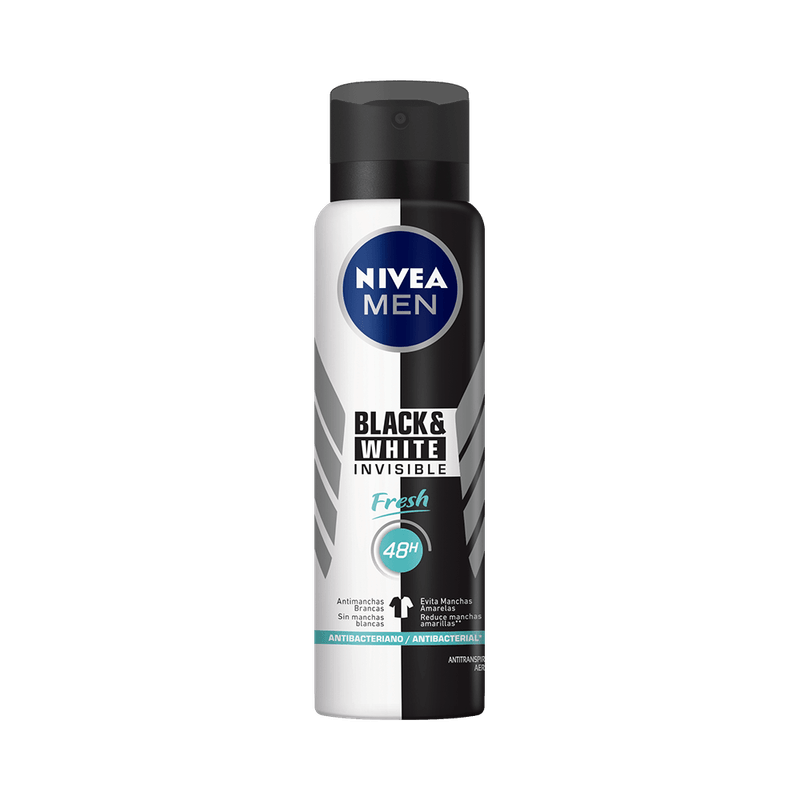 NIVEA Men Desodorante Antitranspirante Aerosol Invisible for Black & White Fresh: Fórmula antibacteriana que elimina 99,99% das bactérias**. Protege suas roupas do preto ao branco. 48 horas de proteção e refrescância. Você livre de manchas***, suor e do mau odor. * *Elimina 99,99% das bactérias testadas: Corynebacterium xerosis e Staphylococcus epidermidis ***Evita as manchas