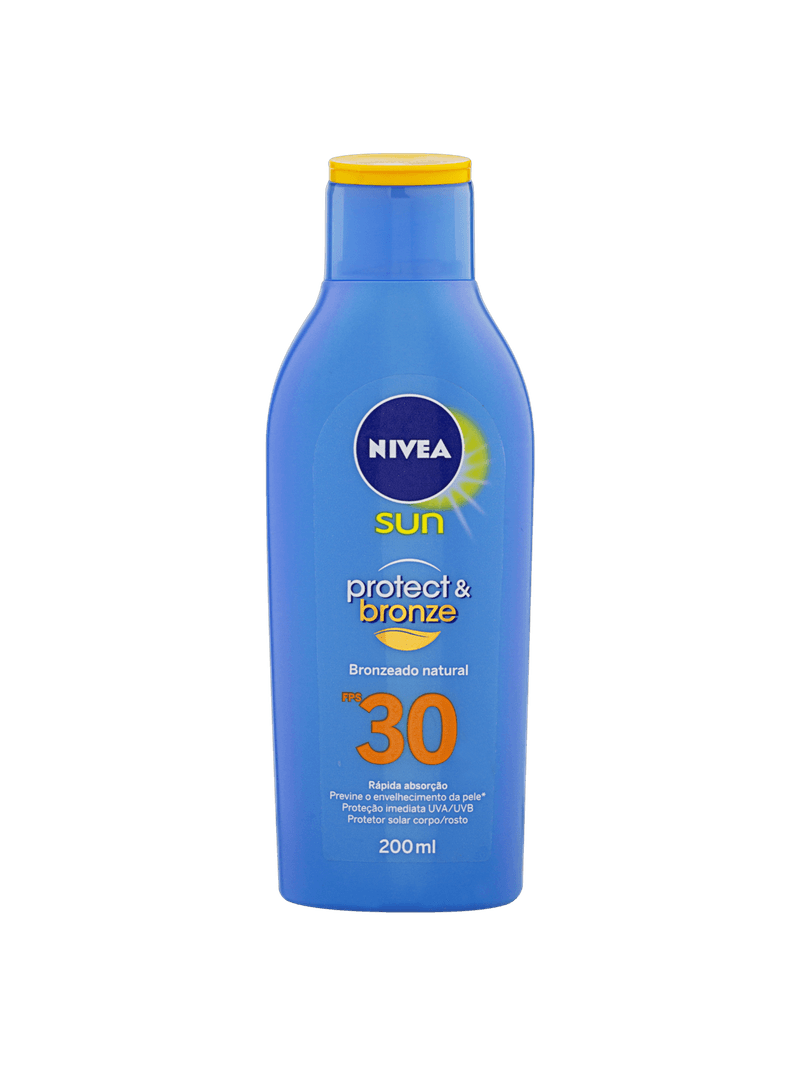 Nivea sun protect&bronze proporciona alta proteção imediata contra os raios uva/uvb com textura leve, suave e de rápida absorção. Além de contar com uma combinação de betacaroteno e acido glicirretínico em sua fórmula, que ativa a melanina e estimula o bronzeado natural da pele, ajudando a manter a cor bonita e uniforme por muito mais tempo. Proteção contra os raios uva/uvb textura leve rápida absorção estimula o bronzeado resistente à água previne o envelhecimento da pele