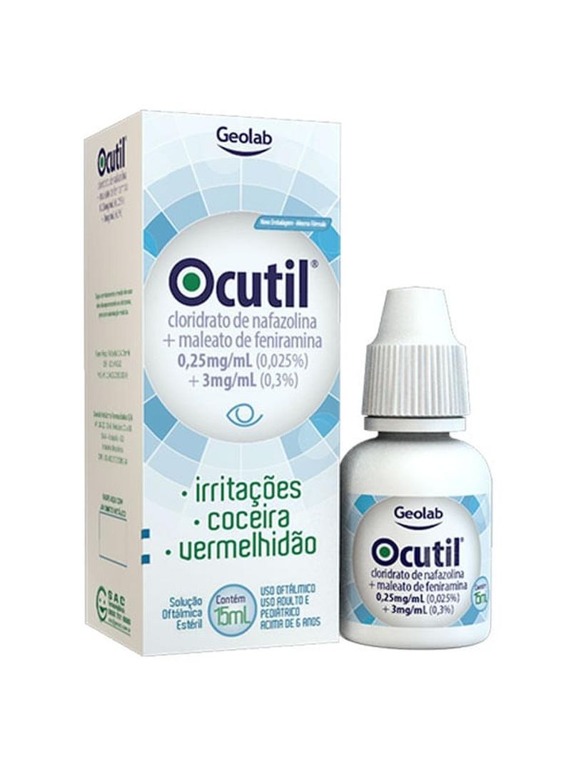 Ocutil Oftámilca 15mL   Indicações: Ocutil está indicado para o alívio da vermelhidão dos olhos causada por poluição, fumaça, pó, pêlos de animais, pólen, grama, caspa, bem como dos sintomas leves de coceira.   Contraindicações: Não deve usar este medicamento se o paciente for alérgico a um de seus ingredientes, se tiver alguma doença cardiovascular, pressão alta, glaucoma de ângulo estreito ou se tiver dificuldade de urinar, exceto sob recomendação médica. Precauções e Advertências: Não deve utilizar este medicamento se estiver usando lentes de contato. Se você sentir dor no olho ou se ocorrer alterações na visão, vermelhidão ou irritação contínua do olho ou se esta condição piorar ou persistir por mais de 72 horas, devese interromper o uso do medicamento e consultar o médico. Não deve usar este medicamento de forma abusiva ou por um período prolongado sem interrupção. Não utilize a solução se esta mudar de cor ou tornar-se turva. Este medicamento não deve ser utilizado em crianças menores de 6 anos sem orientação médica.;Princípio ativo: