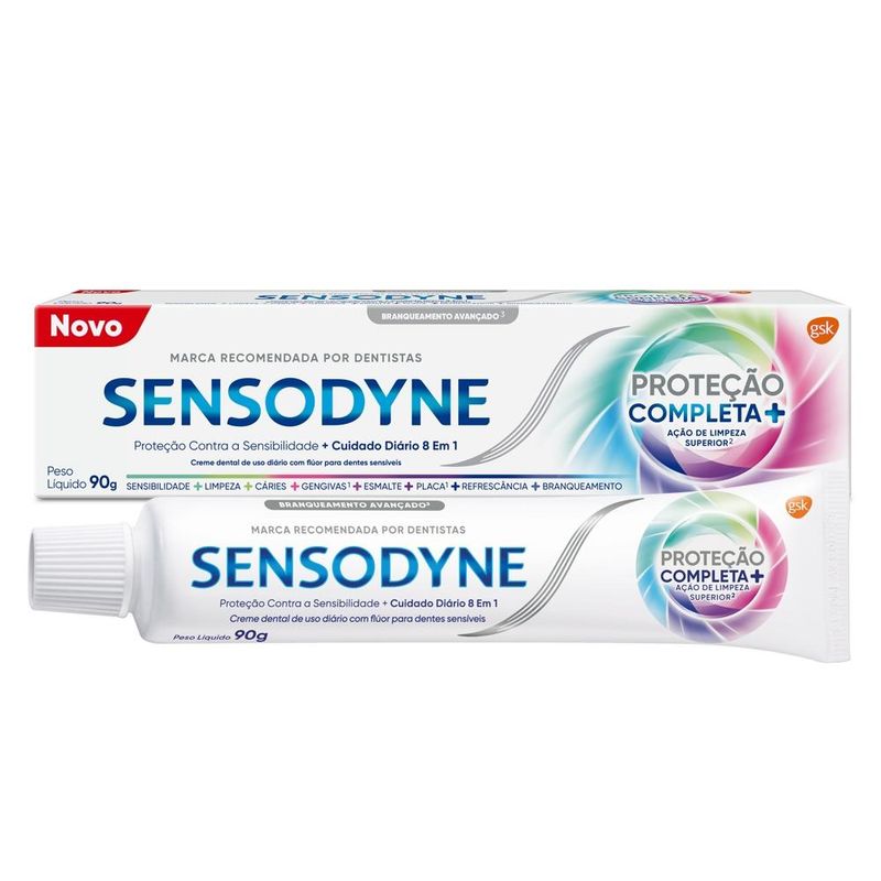 A pasta de dente Sensodyne Proteção Completa é um creme dental de uso diário que promove múltiplos benefícios para a saúde da boca. Clinicamente comprovada, ela protege contra sensibilidade dos dentes e garante um branqueamento avançado para ação clareadora superior. Recomendado por dentistas, Sensodyne Proteção Completa é o primeiro creme dental com sílica esférica, ideal para uma limpeza superior, que não agride os dentes mais sensíveis. Ele conta com sabor mentolado refrescante com toque de extratos naturais, para maior sensação de refrescância e limpeza.