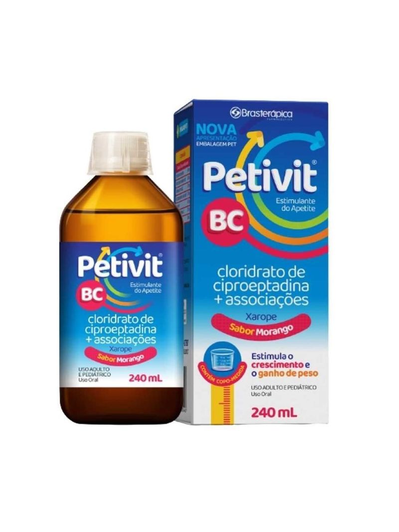 ;Indicações: PETIVIT-BC é indicado como estimulante do apetite, para pacientes com pouco apetite ou com maus hábitos alimentares. Para crescimento e ganho de peso. Para prevenção de deficiências de vitaminas do Complexo B e da Vitamina C.   Contraindicações: Nos casos de hipersensibilidade aos componentes da fórmula. Sendo o cloridrato de ciproeptadina uma substância anticolinérgica, apesar desse efeito ser mínimo na posologia recomendada, o produto é contraindicado na presença de glaucoma do ângulo fechado ou aberto, predisposição à retenção urinária e nos pacientes portadores de úlcera péptica estenosante ou obstrução piloro-duodenal, hipertrofia prostática ou, obstrução do colo vesical. é também contraindicado o tratamento concomitante com inibidores da monoaminoxidase. Não deve ser administrado a pacientes debilitados ou em ataque agudo de asma. Qualquer substância anti-histamínica não deve ser usada por lactantes de recém-nascidos prematuros. Por conter açúcar em sua formulação, PETIVIT-BC não deve ser utilizado por pacientes que tenham diabetes. Por conter vitamina C na formulação de PETIVIT-BC, deverá ser avaliada a relação risco-benefício em pacientes com hiperoxalúria, cálculos renais, hemocromatose, anemia sideroblástica, talassemia e anemia depranócita.;Princípio ativo: