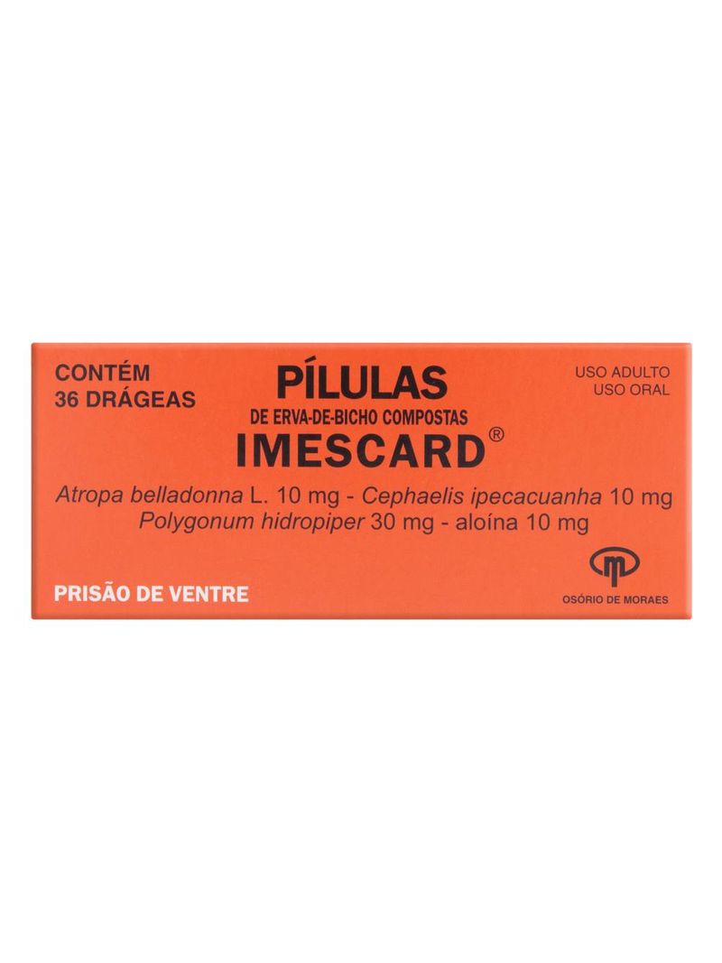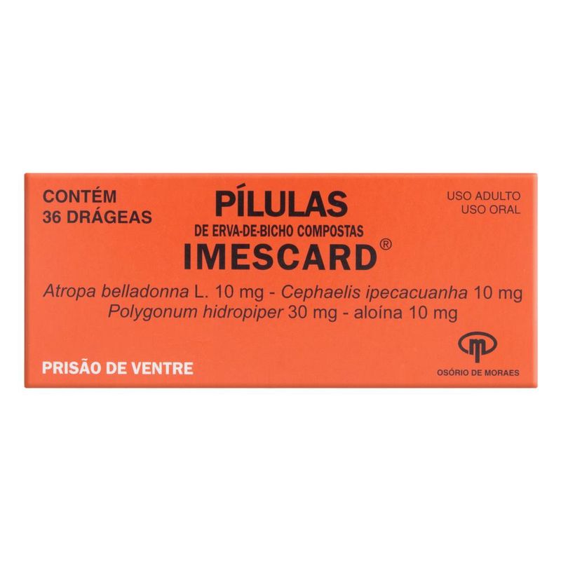 Pílulas de Erva-de-Bicho Compostas Imescard são destinadas ao tratamento da prisão de ventre e auxilia no tratamento das hemorroidas. Como este medicamento funciona? a Erva-de-bicho (Polygonum hydropiper) devido à presença de taninos em sua composição possui ação sobre o ingurgitamento hemorroidal (inchaço das veias hemorroidárias). a Beladona é outra espécie vegetal usada nos espasmos intestinais (cólicas). a ação do produto como anticonstipante (contra prisão de ventre) encontra-se principalmente na presença da Aloína que possui propriedades estimulantes dos movimentos peristálticos (movimentos do intestino) favorecendo a função intestinal. a Ipeca (Cephaelis ipecacuanha) favorece a secreção dos sucos digestivos e os movimentos peristálticos no tubo gastrintestinal.
