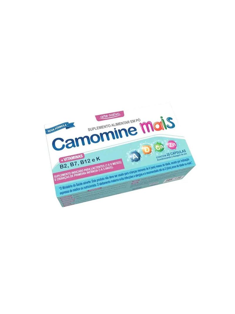 Polivitamínico Infantil Arte Nativa Camomine Mais com 20 Cápsulas. Composição: vitamina a: auxilia na manutenção de mucosas e no funcionamento do sistema imune;vitamina d: auxilia na formação de ossos e dentes e na absorção de cálcio e fósforo;Vitamina B12: auxilia no funcionamento do sistema imune e na formação de células vermelhas do sangue;Vitamina B2: contribui para a manutenção da pele e de mucosas e auxilia na visão;Biotina: auxilia na manutenção das mucosas e no metabolismo de proteínas, carboidratos e gorduras;Vitamina k; auxilia na manutenção dos ossos e na coagulação do sangue;Cálcio: auxilia na formação e na manutenção de ossos e dentes e no funcionamento neuromuscular;Zinco: auxilia na manutenção de ossos e no metabolismo da vitamina a.