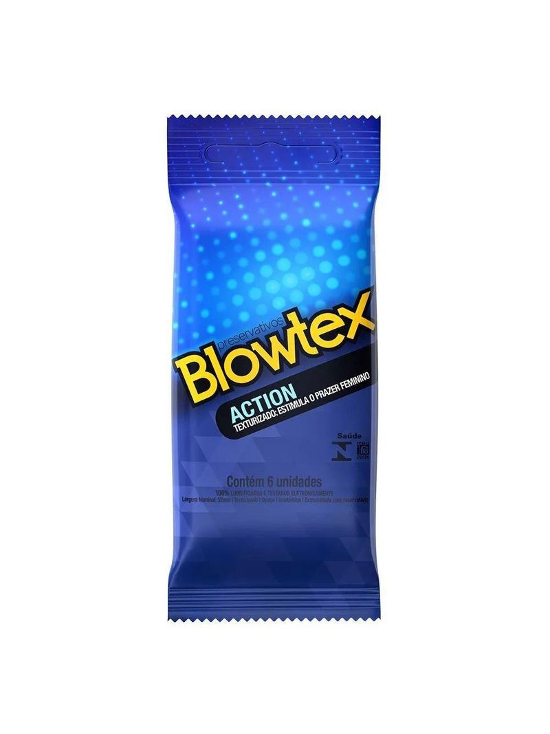 O Preservativo Blowtex Action C/ 6 Unidades é feito em poliisopreno, um látex de borracha que proporciona ao preservativo características revolucionárias. Sua textura sensível e ao mesmo tempo segura garante uma sensação bem próxima do natural. Este produto é rigorosamente testado e atende aos mais altos padrões de segurança, sua melhor escolha. Além de importante contraceptivo, a camisinha é um dos principais métodos para a prevenção de doenças sexualmente transmissíveis. Recomenda-se retirar o preservativo da embalagem individual somente no momento em que for usá-lo.