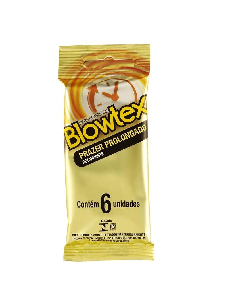 O Preservativo Blowtex Retardante 6 Unidades foi desenvolvido com um lubrificante especial que em contato com o pênis traz um efeito retardante e prolonga o tempo de ereção. É feito em látex de borracha natural, lubrificante e benzocaína 4,5% (gel retardante que em contato com o pênis prolonga a ereção). O preservativo Blowtex Prazer Prolongado é contraindicado para pessoas que apresentem sensibilidade a Benzocaína. Além de importante contraceptivo, a camisinha é um dos principais métodos para a prevenção de doenças sexualmente transmissíveis.