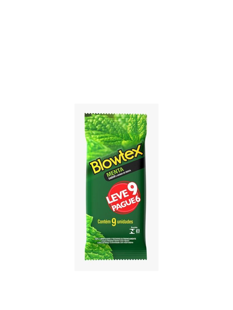 Preservativo Blowtex Menta Leve 9 Pague 6 unidades Blowtex menta tem o irresistível sabor e aroma de menta e ajuda a estimular todos os sentidos. Tenha muito mais prazer: no clima quente, uma sensação refrescante. Todos os preservativos são testados eletronicamente. Nessa embalagem, leve 9 preservativos pelo preço de apenas 6.