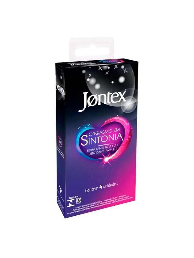 O Preservativo Jontex Orgasmo e sintonia foi criado com o intuito de proporcionar uma relação intensa para o casal, ajudando a atingir o clímax sincronizado com lubrificante especial retardante para o orgasmo do homem e texturas para intensificar ao máximo o prazer da mulher. Enquanto age como estimulante para ela, tem o efeito retardante para ele.