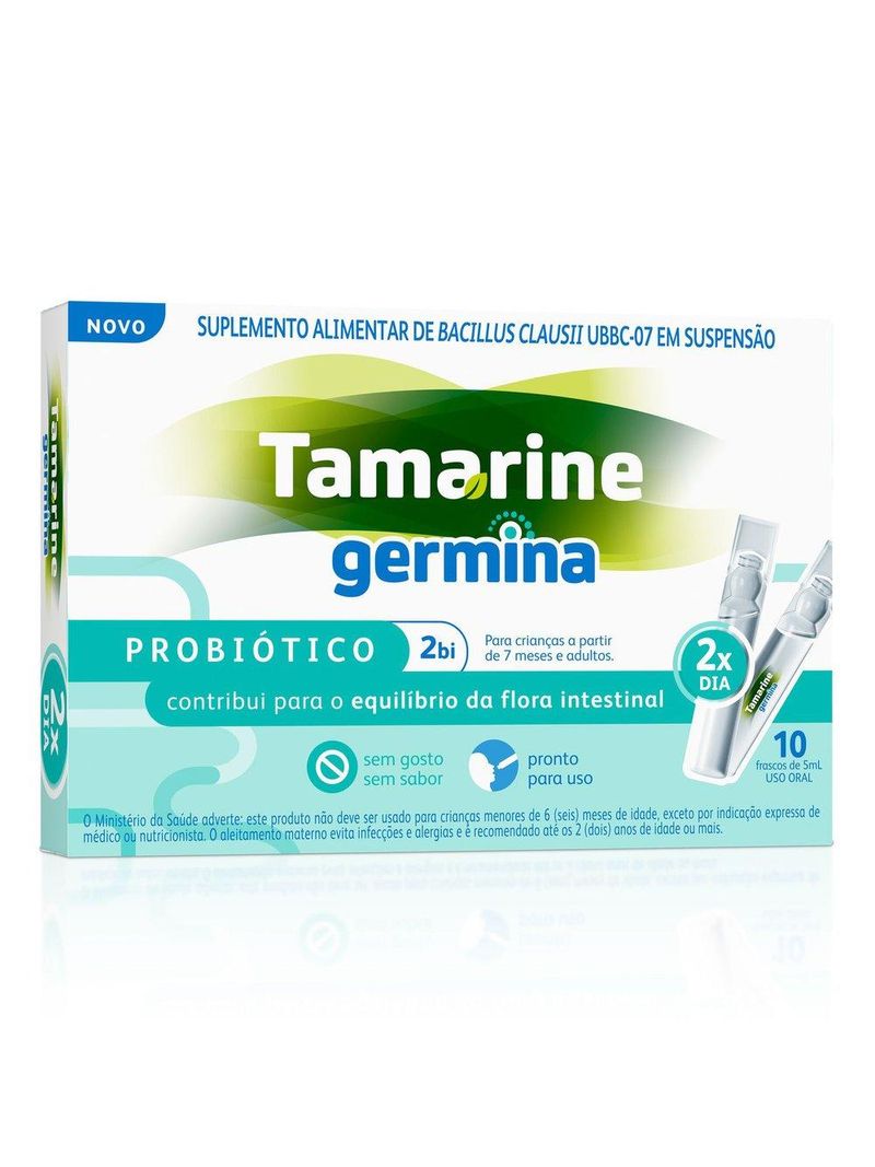 O que é o Tamarine Germina? Tamarine Germina é um probiótico composto por 2 bilhões de Bacillus Clausii UBBC-07 em suspensão. Para que serve o probiótico Tamarine Germina? Os esporos de Bacillus Clausii são probióticos/microrganismos também conhecidos como "bactérias boas". Eles são capazes de chegar vivos no intestino, formando uma barreira protetora contra germes e/ou agentes agressores e restabelecendo o equilíbrio da flora intestinal. Benefícios e diferenciais do probiótico Tamarine Germina Probiótico líquido. Atua no equilíbrio da flora intestinal. Ajuda no controle de casos de diarreia (3 ou mais evacuações em 24h). Sem sabor. Zero açúcares. Não contém glúten. Pronto para consumo. Como usar o probiótico Tamarine Germina? Para crianças a partir de 7 meses e adultos é recomendável consumir uma vez ao dia ou seguir a recomendação do médico/nutricionista. Advertências O MINIESTÉRIO DA SAÚDE ADVERTE: ESTE PRODUTO NÃO DEVE SER USADO PARA CRIANÇAS MENORES DE 6 (SEIS) MESES DE IDADE, EXCETO POR INDICAÇÃO EXPRESSA DE MÉDICO OU NUTRICIONISTA. O ALEITAMENTO MATERNO EVITA INFECÇÕES E ALERGIAS E É RECOMENDADO ATÉ OS 2 (DOIS) ANOS DE IDADE OU MAIS.
