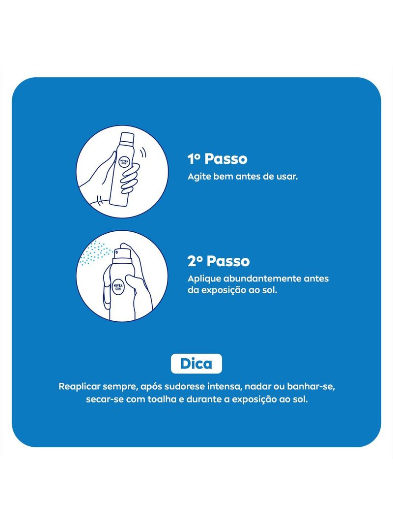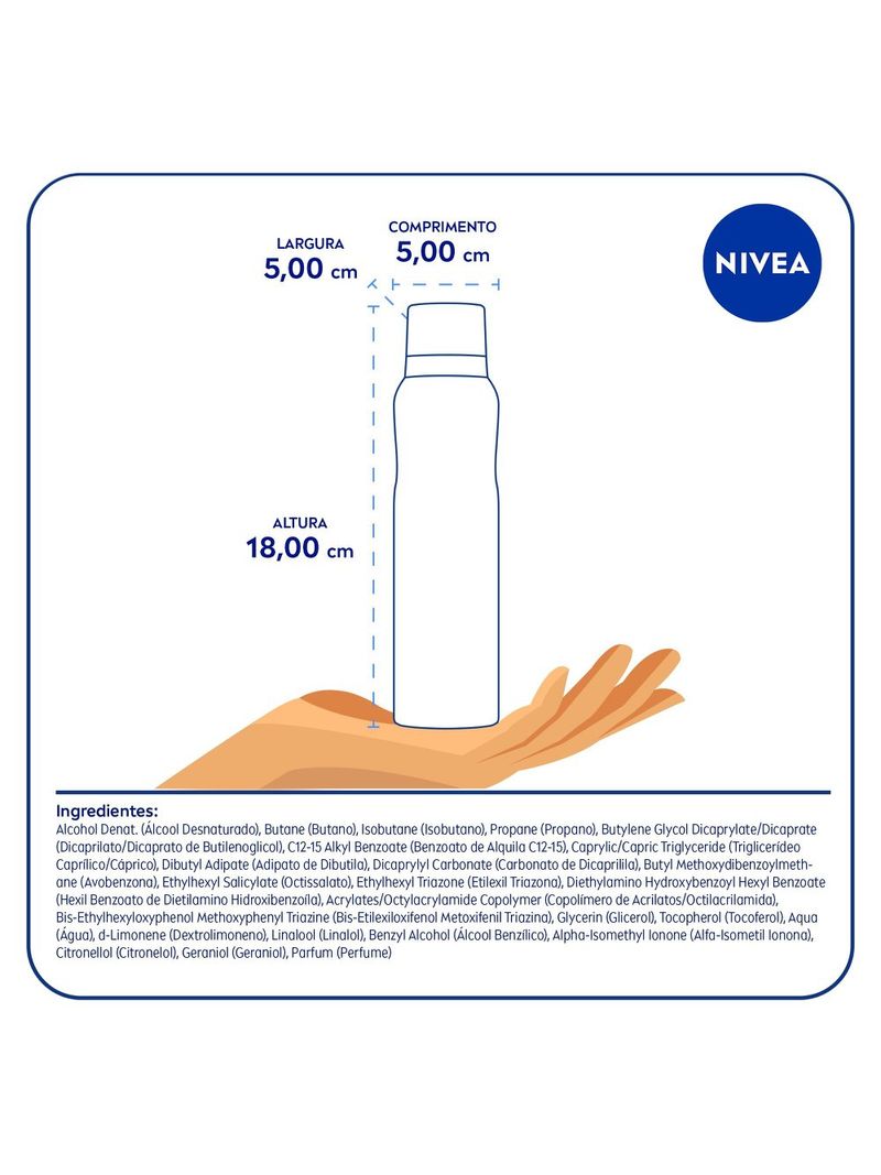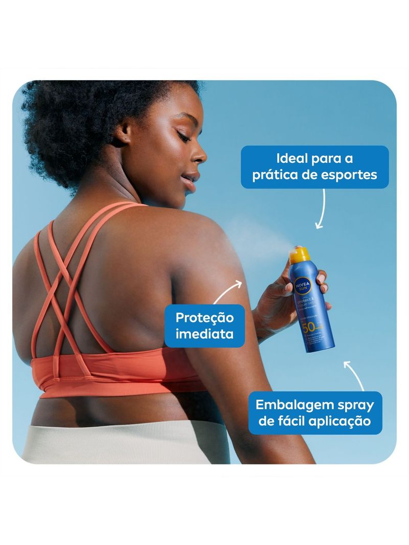 O Protetor Solar Nivea Sun Spray Protect&Toque Seco FPS50 foi desenvolvido para proporcionar alta proteção contra os raios UVA/UVB e uma sensação refrescante na pele. Sua fórmula possui uma textura com toque seco, resistente à água, não gordurosa (oil free) garante a ultra absorção do produto em todos os tipos de pele. A Fórmula também respeita o oceano, sendo livre de filtros UV Octinoxato e Oxibenzona e 90% biodegradável.