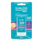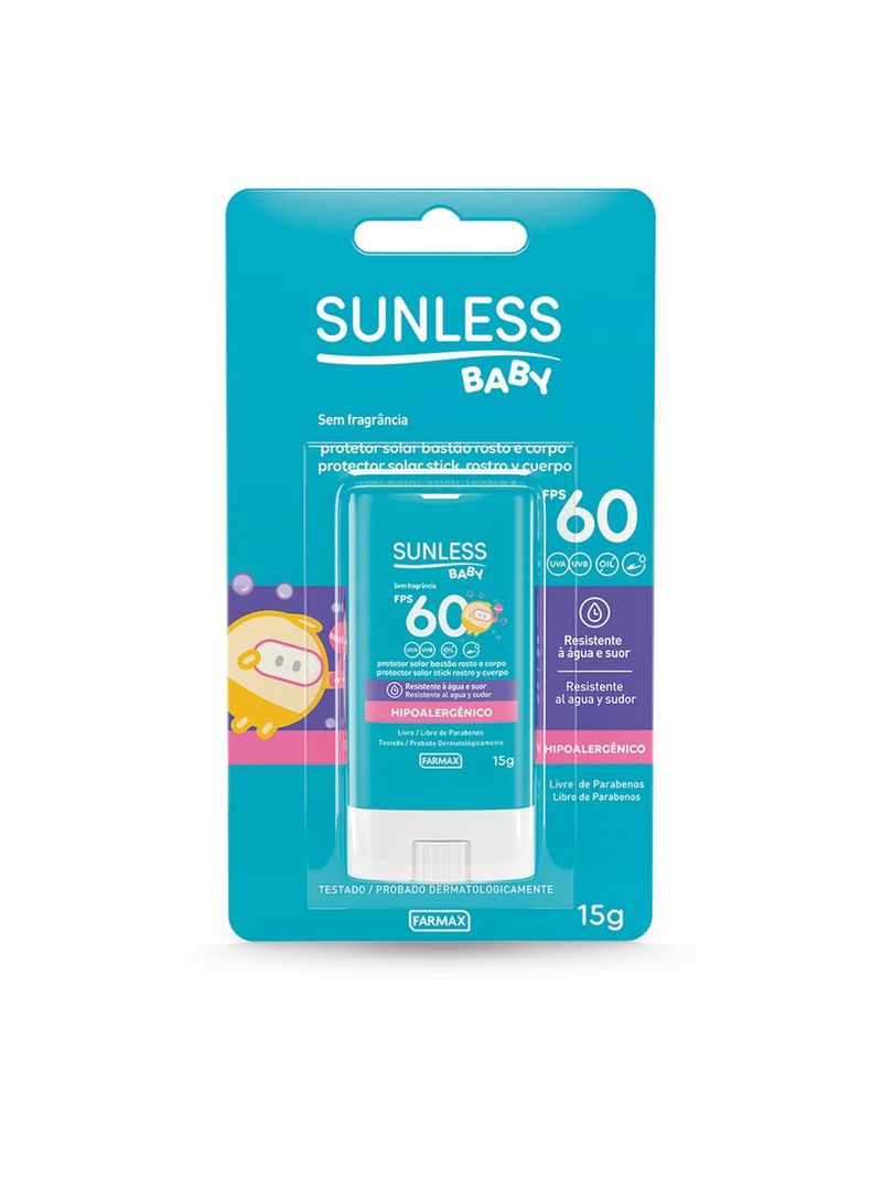 O Protetor Solar FPS 60 Baby Bastão Sunless oferece proteção muito alta contra os raios UVA e UVB e é indicado para pele extremamente sensível à queimadura solar. Sua fórmula é suave e delicada, especial para a pele sensível dos bebês e crianças. Possui toque seco e é um forte aliado no combate à formação de radicais livres, prevenindo o envelhecimento precoce da pele ocasionado pela exposição excessiva ao sol. TESTADO DERMATOLOGICAMENTE - É LIVRE DE PARABENOS E RESISTENTE À ÁGUA E SUOR.