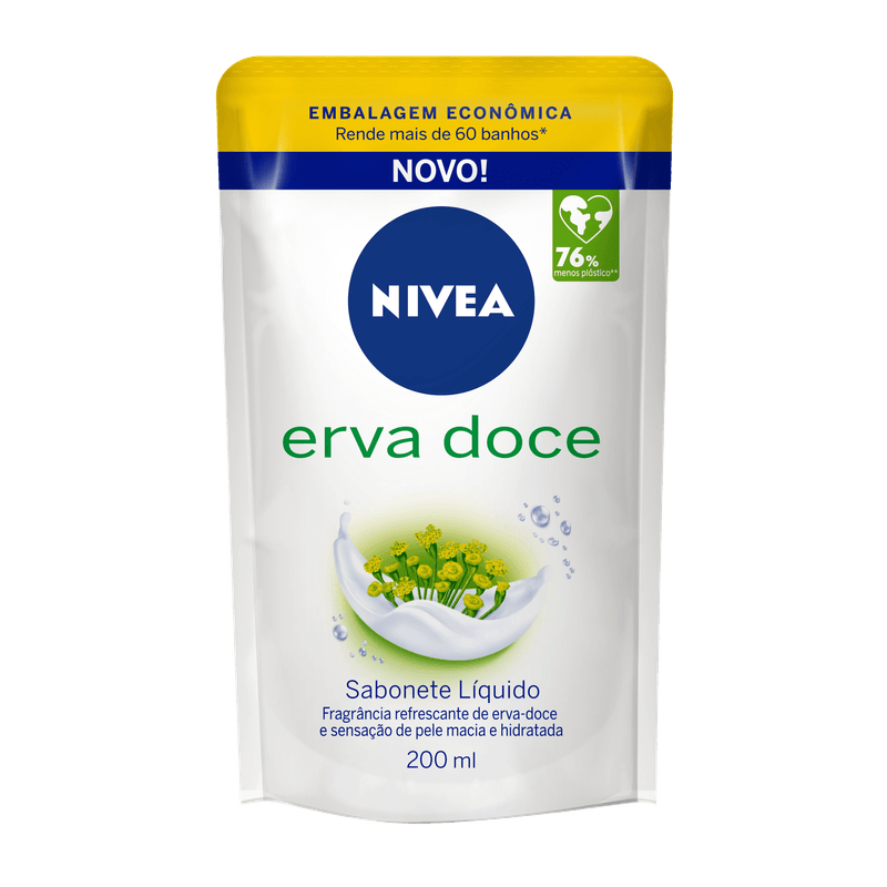 O cuidado com você começa no banho. Tenha a experiência única de carinho e cuidado do NIVEA Erva Doce durante o banho. Fórmula especialmente desenvolvida com a fragrância intensa de erva doce que deixa uma sensação de pele macia e hidratada, enquanto sua espuma cremosa e fragrância refrescante envolvem sua pele carinhosamente. Sinta-se renovada em todos os banhos com o cuidado de NIVEA. Dermatologicamente testado e rende mais de 60 banhos (Testado com 3 ml na esponja), além de possuir 76% menos plástico (Comparado com a embalagem regular de 250ml).